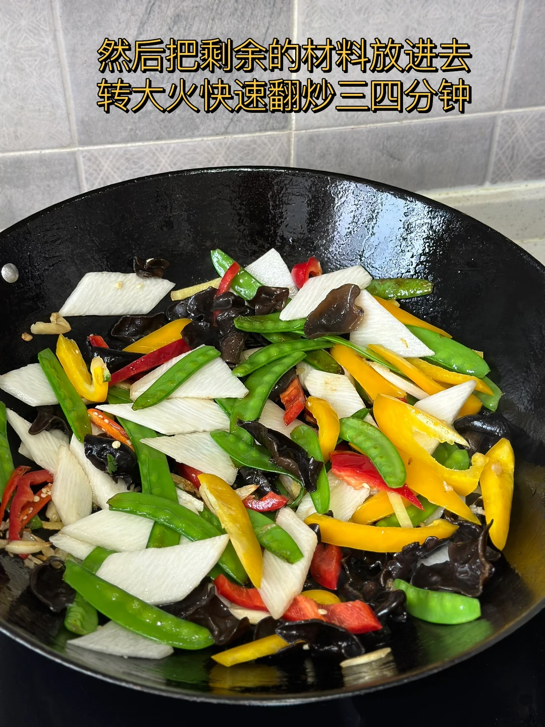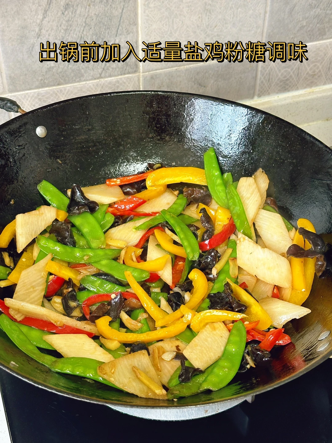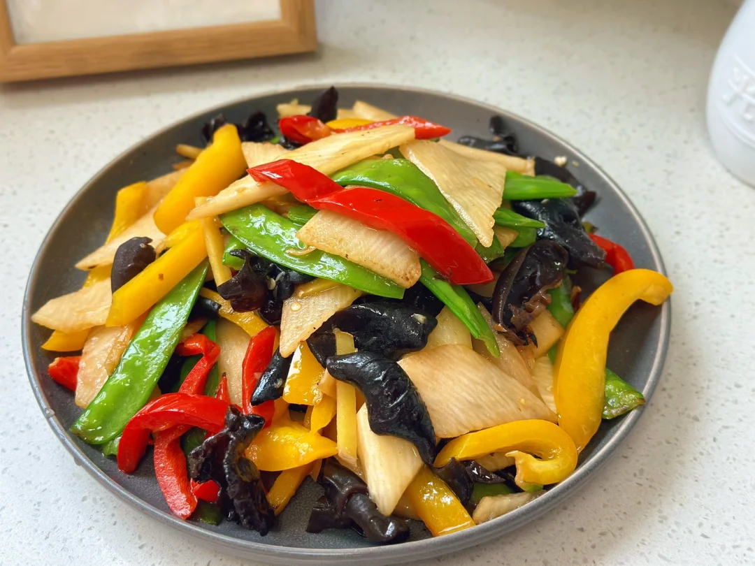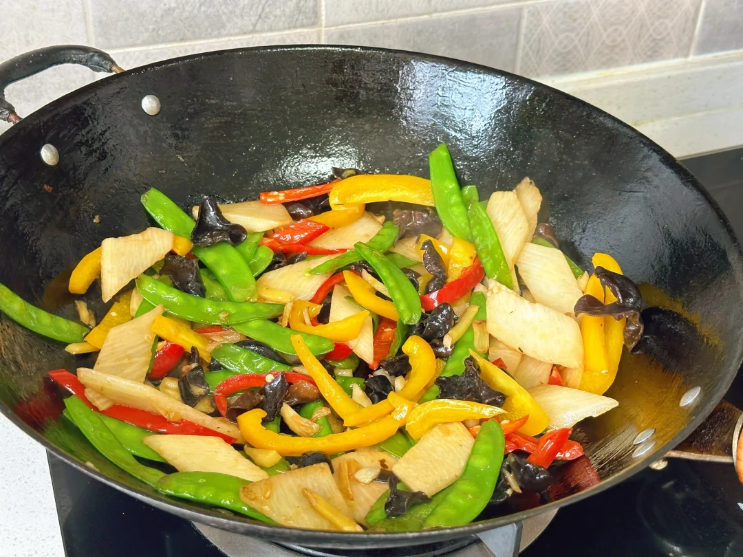 最近特别爱吃炒脆脆的山药,刚好家里刚买了很多配菜放在一起来了一个大杂烩,好吃营养减肥 1. 木耳用热水泡一会儿,记住千万别隔夜哦 2. 因为拔了牙齿不能吃辣椒就买了甜椒骗骗自己哈哈喜欢吃辣的放辣的就可以了 3. 我喜欢脆脆的山药,洗干净戴手套削皮切成薄薄的片儿水里泡一下 4. 小火爆香大蒜生姜,荷兰豆放进去先炒两三分钟 5. 然后把剩余的材料放进去转大火快速翻炒三四分钟 6. 加入一勺薄盐生抽 7. 出锅前加入适量盐鸡粉糖调味