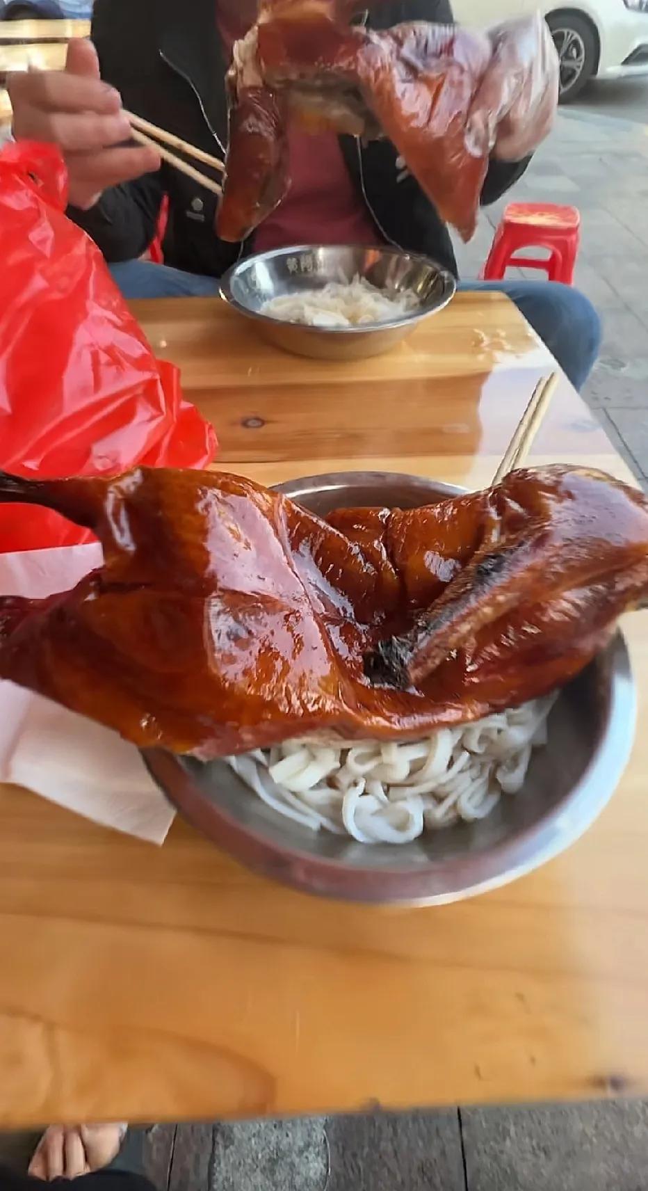 这是什么吃法?太豪横了,这么大只的烤鸭配粉条?哪里的特色美食啊,大半夜看的挺有食欲……豪横![赞]