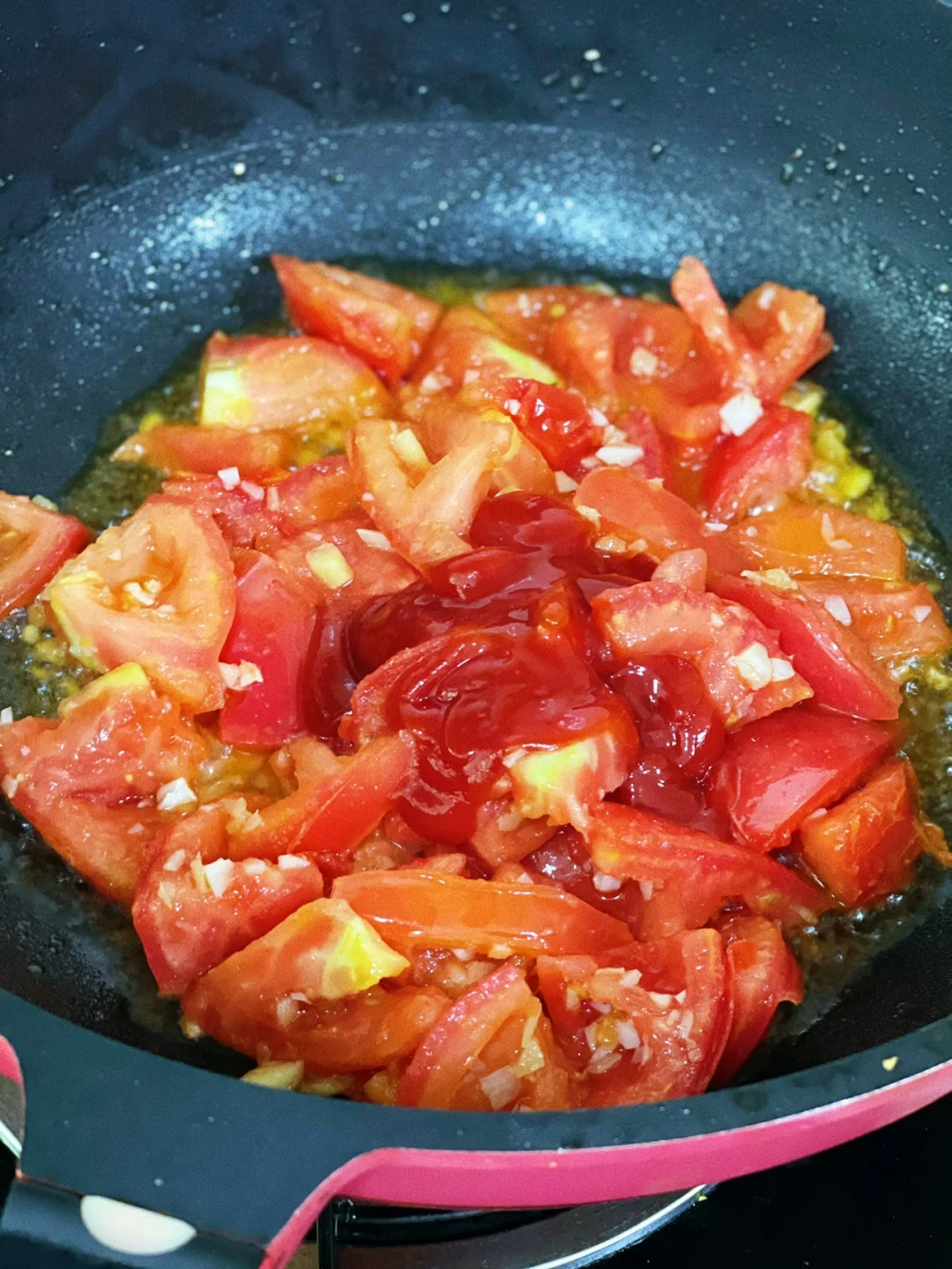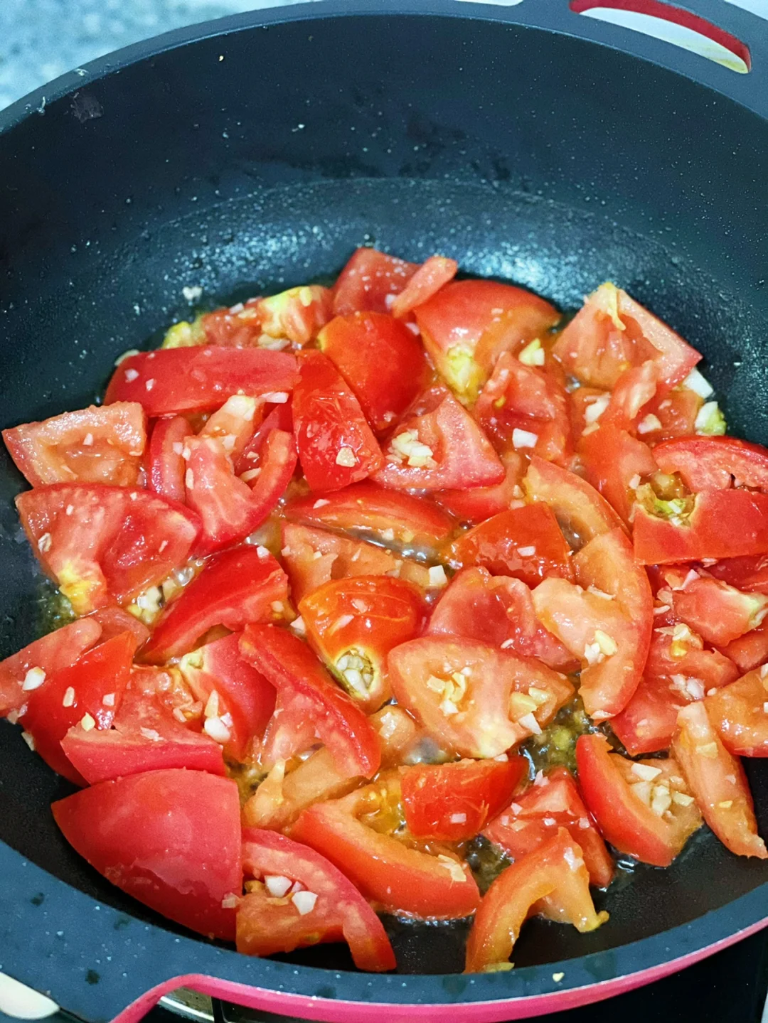 3.重新洗锅上油爆香大蒜生姜沫,沥干水的番茄块倒进去转大火快速翻炒