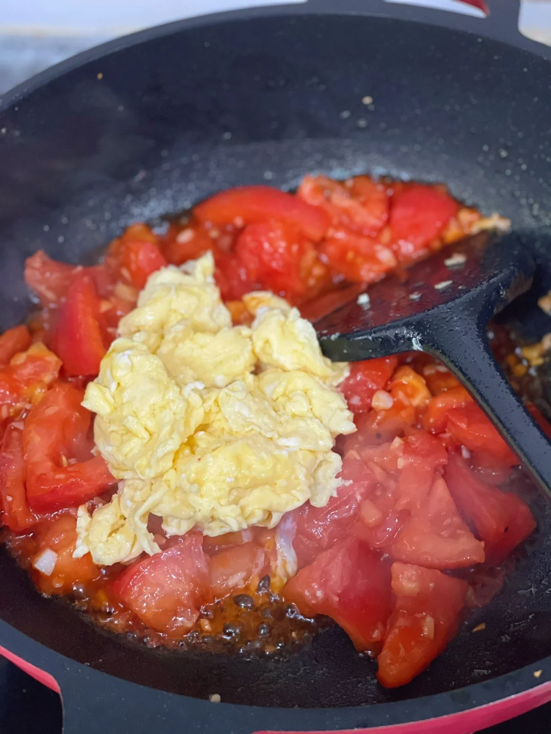 4.番茄炒两三分钟放入两大勺番茄酱,这个是灵魂做出来味道会更浓郁一些,再炒两分钟把鸡蛋块倒进去一起炒匀