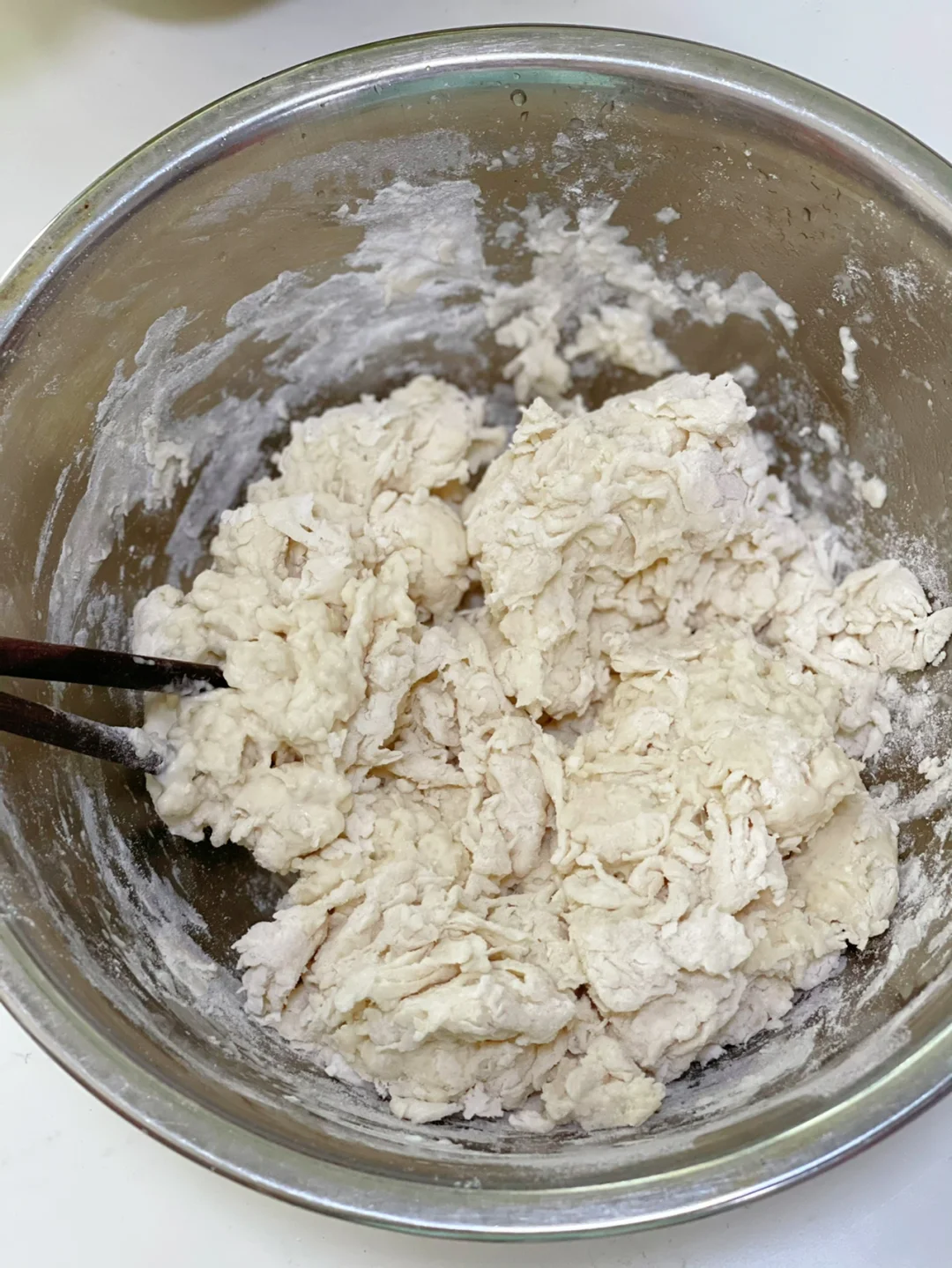 6.准备一个大一点的容器,面粉放进去,然后水龙头放一线的水,千万别太大,然后同时用筷子不停的搅拌,这样的絮状就可以了,除非你喜欢大面疙瘩