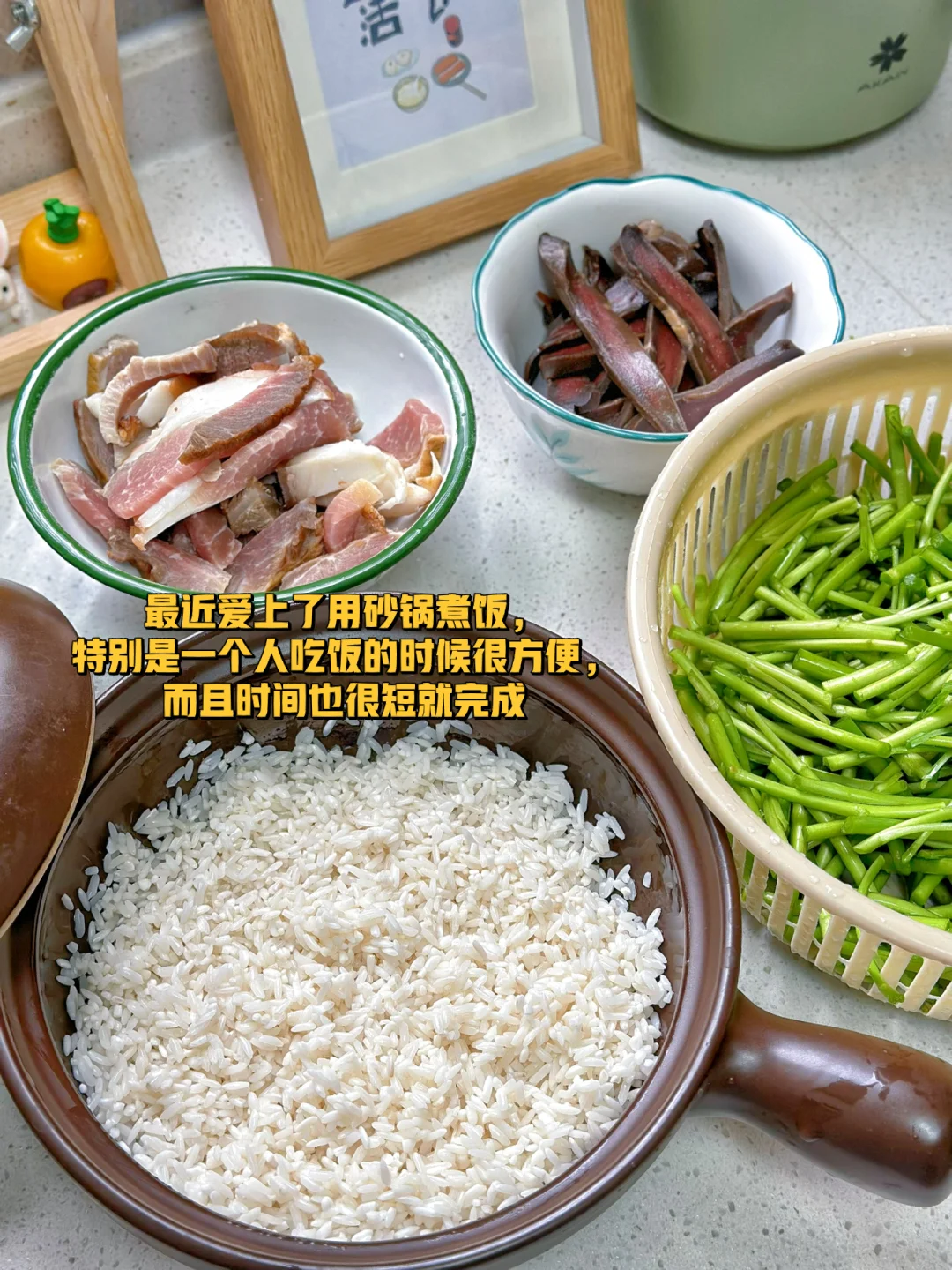 以前偶尔看见藜蒿也会买一下,这次去菜市场感觉也没什么好买的,看见这个泥蒿不错,没有想到居然还挺贵的,更有意思的事情是昨天我吃这个的时候发图片给闺蜜她居然也是炒这个菜吃,还别说挺嫩的和腊肉炒起来特别香 1. 最近的泥蒿还挺嫩,就是有点贵,差不多十几块一斤了,叶子摘掉不要 2. 今天我是用腊肉炒的,没有的话用新鲜的 五花肉也一样,最近爱上了用砂锅煮饭,特别是一个人吃饭的时候很方便,而且时间也很短就完成 3. 摘掉叶子的泥蒿,我们切成这样的长段洗一下沥干水待用 4. 锅里放少许油腊肉放进去翻炒一下再把大蒜生姜干辣椒放进去继续小火炒香 5. 再把藜蒿放进去转大火快速翻炒两分钟加入一丢丢薄盐生抽少许糖盐鸡粉就可以了,来个近照给你们瞅瞅