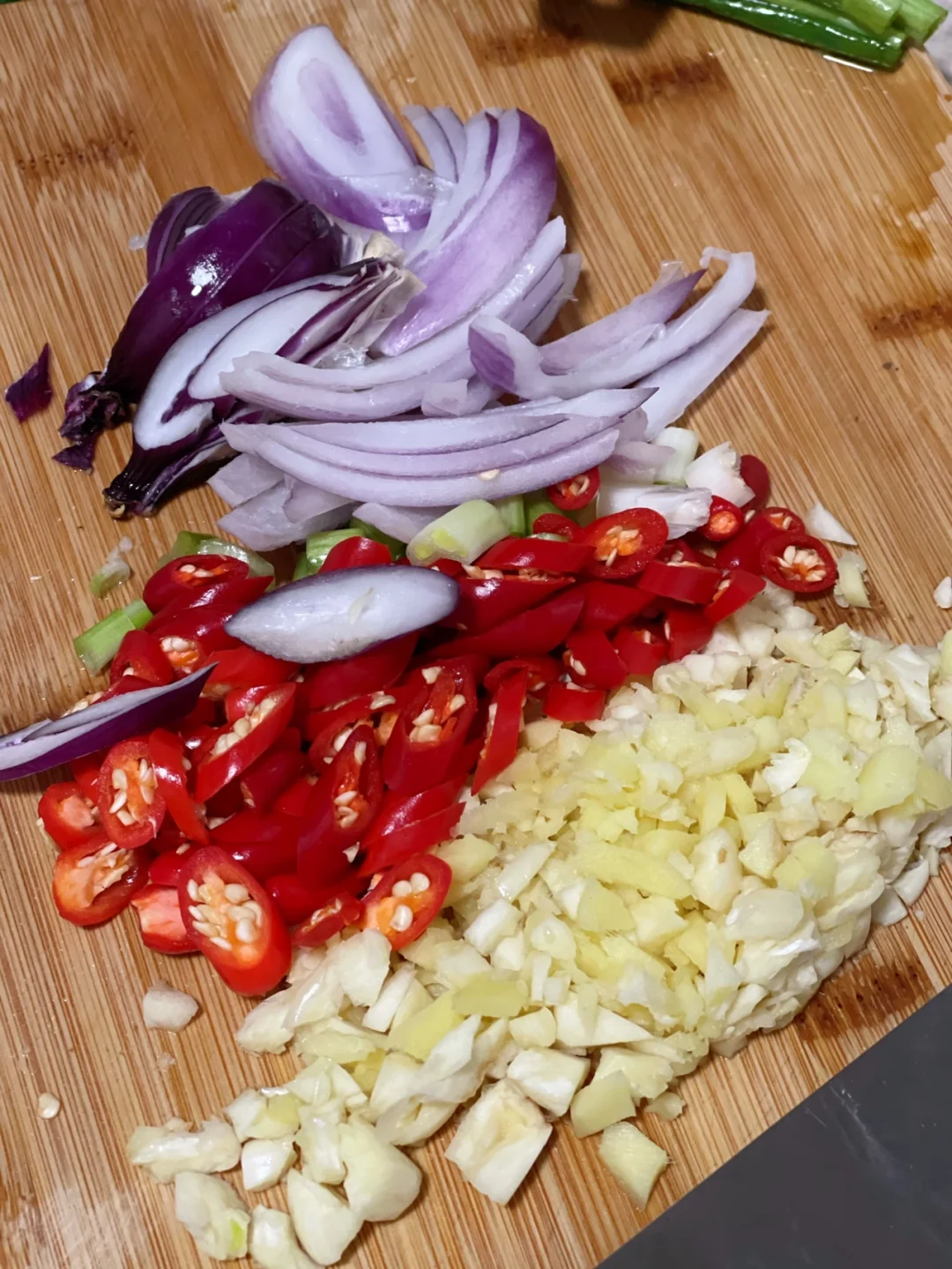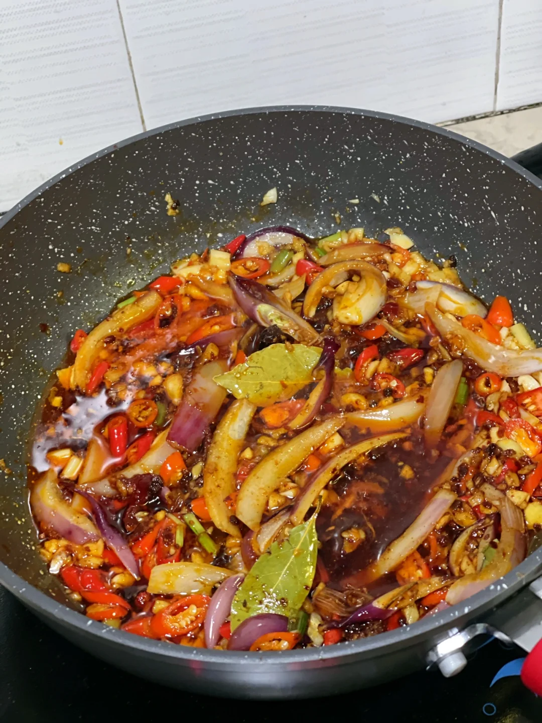 4. 锅里放入稍微多一些的油切好的大蒜生姜小米辣,还放了一点香叶进去小火爆香之后加入多一点的火锅底料,一勺豆瓣酱小火慢慢炒出红油