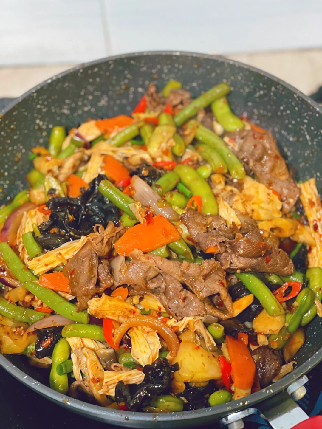5. 所有做好水的配菜和肉,放进去快速翻炒匀,加入一勺料酒,一勺生抽适量盐鸡粉,糖调味,出锅前还可以放入多一些的蒜苗和长的葱段都是可以的,还可以放一些芝麻