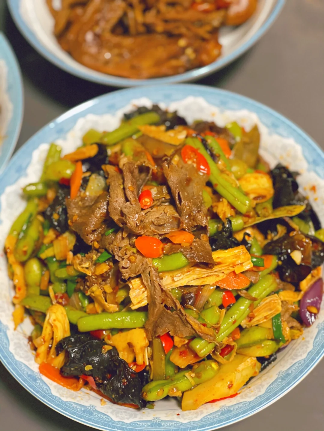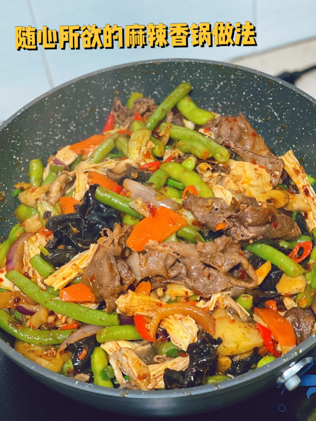 1. 这吃的麻辣香锅其实是清理冰箱剩余的一些边角料,所以放的比较杂,你们可以根据自己的喜好来我今天放的有腐竹,胡萝卜,平菇,木耳,四季豆,土豆,毛豆,肥牛卷,竹笋....