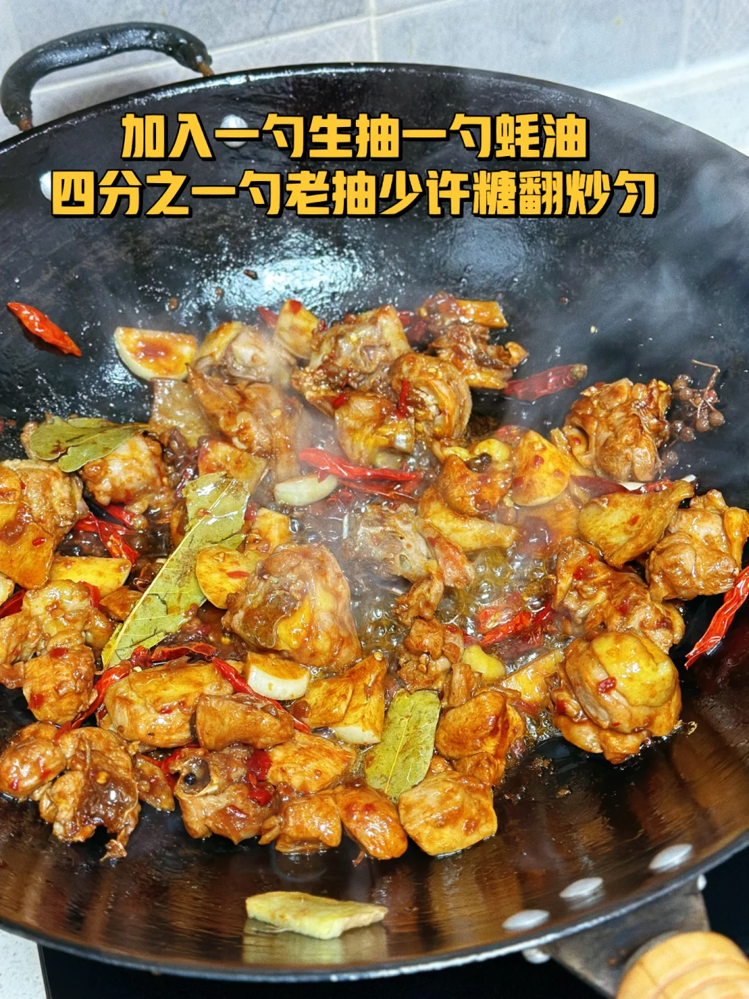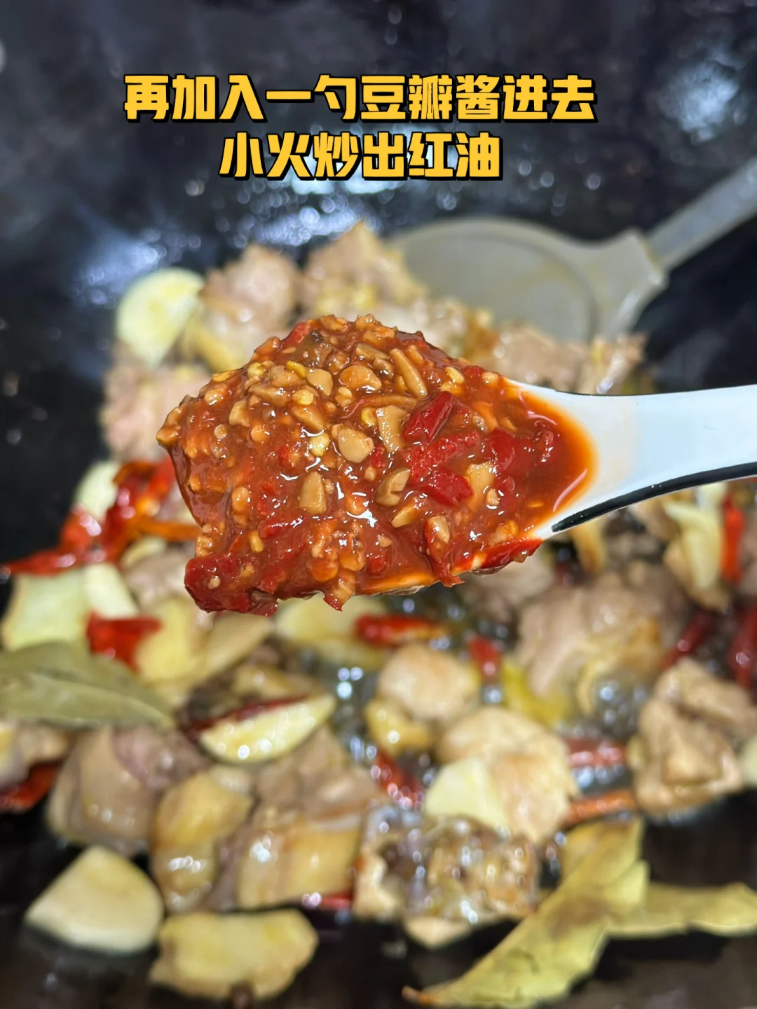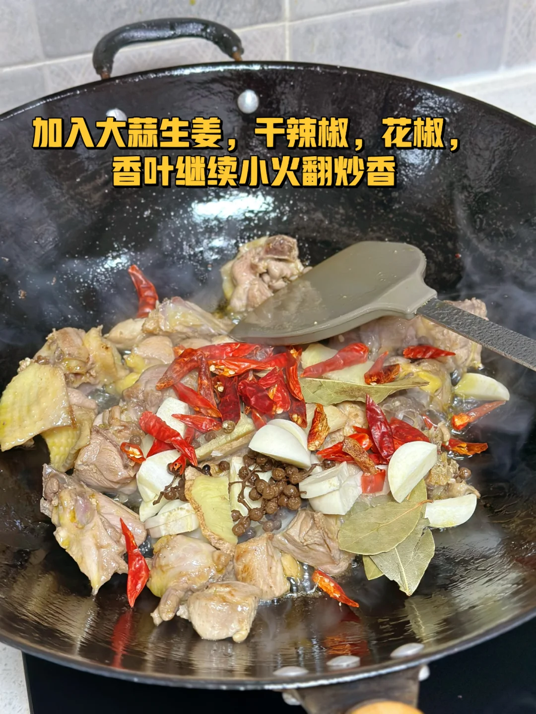 妈妈快递来的土鸡太多了得赶紧消耗掉一些冰箱库存 前几天炖了土豆 今天试试炖萝卜,居然也不错耶萝卜吸收了土鸡的香味,入口即化的感觉 1. 锅里放入少许油洗干净的鸡块放进去扁炒至微焦 2. 加入大蒜生姜干辣椒,花椒,香叶继续小火翻炒香 3. 再加入一勺豆瓣酱进去小火炒出红油 4. 加入一勺生抽一勺蚝油四分之一勺老抽少许糖翻炒匀 5. 加入适量的水如果你是用高压锅煮的话,水可以少一点 6. 高压锅上气之后再煮八分钟左右,然后把削好皮的萝卜块放进去,继续煮四五分钟 7. 好了以后加入适量的盐鸡粉调味出锅在撒少许葱花就可以