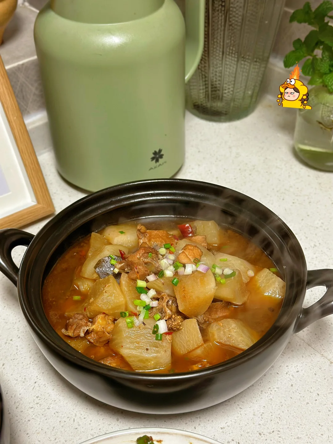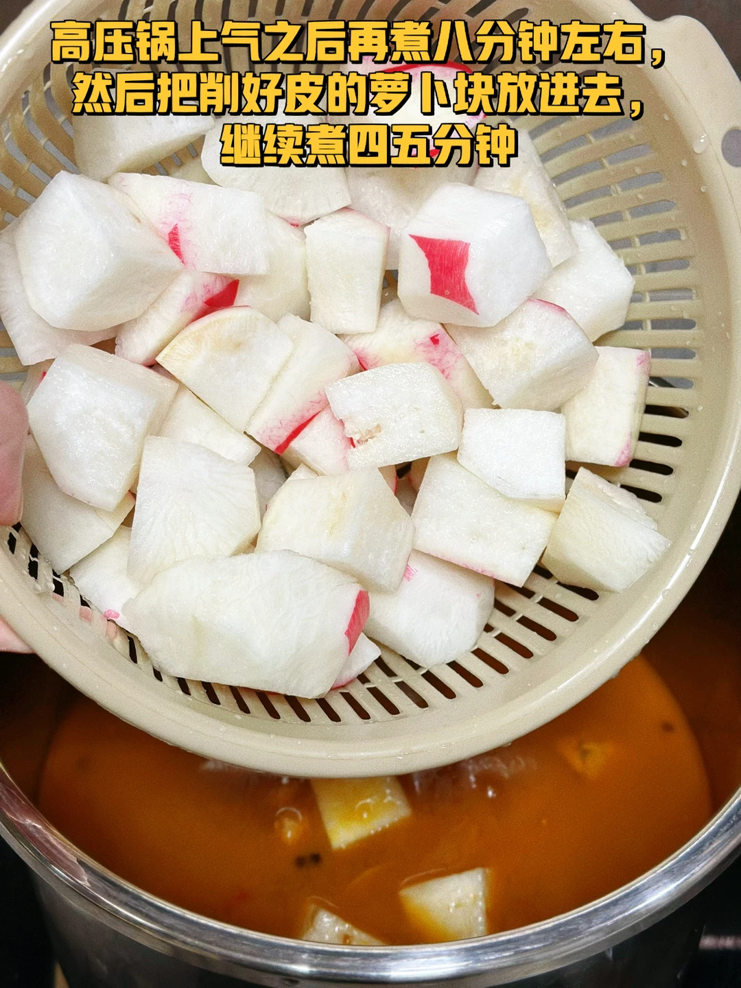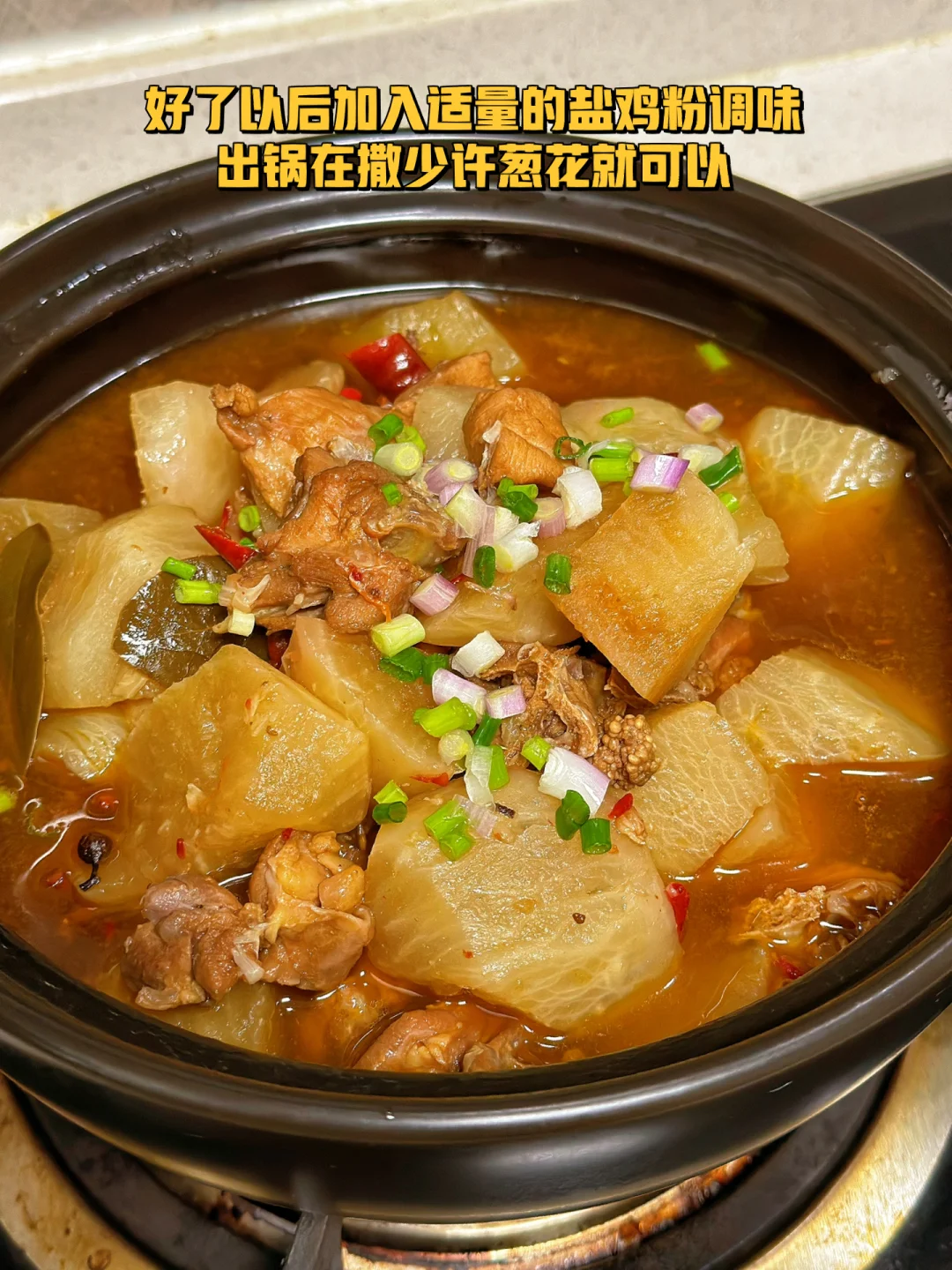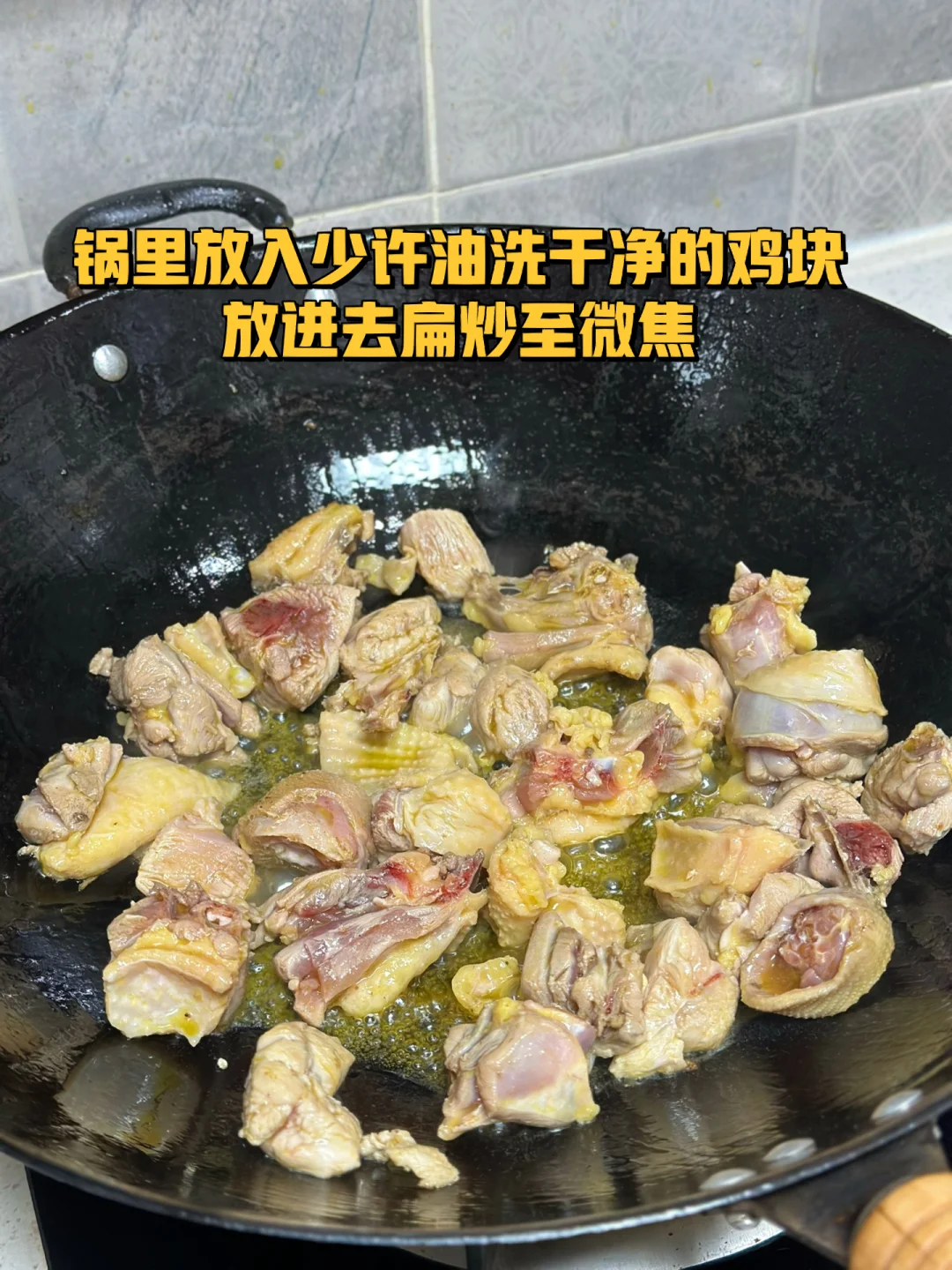 妈妈快递来的土鸡太多了得赶紧消耗掉一些冰箱库存 前几天炖了土豆 今天试试炖萝卜,居然也不错耶萝卜吸收了土鸡的香味,入口即化的感觉 1. 锅里放入少许油洗干净的鸡块放进去扁炒至微焦 2. 加入大蒜生姜干辣椒,花椒,香叶继续小火翻炒香 3. 再加入一勺豆瓣酱进去小火炒出红油 4. 加入一勺生抽一勺蚝油四分之一勺老抽少许糖翻炒匀 5. 加入适量的水如果你是用高压锅煮的话,水可以少一点 6. 高压锅上气之后再煮八分钟左右,然后把削好皮的萝卜块放进去,继续煮四五分钟 7. 好了以后加入适量的盐鸡粉调味出锅在撒少许葱花就可以