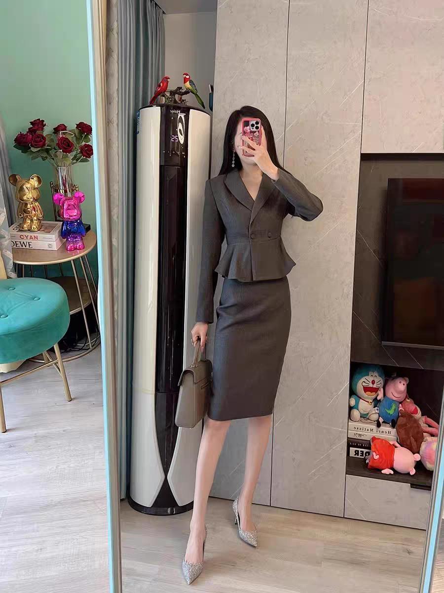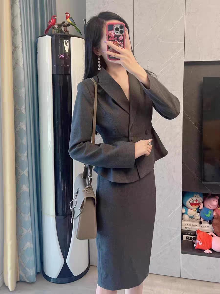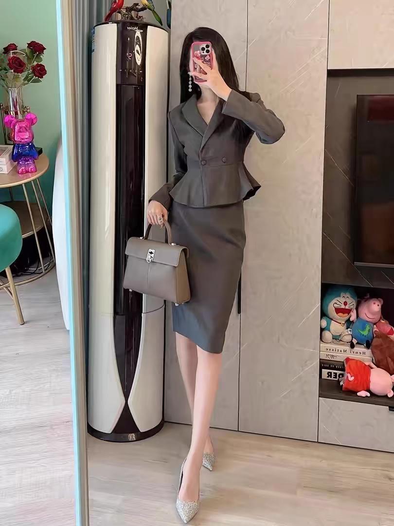 法式灰色职业套装的包臀半身裙两件套,简直是时尚利器!就像常见的白色T恤搭配灰色包臀裙,简单却时尚大气。包臀裙这一时尚款式近两年超火,能凸显女性的优雅曲线。 有了它,职场通勤或者日常出街,都能轻松拿捏时尚感。