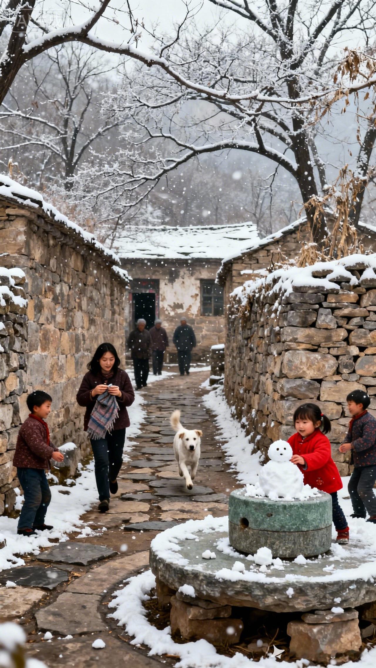 冬日暖阳下,孩子们在雪中嬉戏,欢声笑语洒满古巷。🌨️👧👦🐶