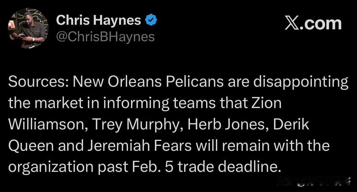 给交易市场泼凉水!!!鹈鹕队已经通知各支球队拒绝交易! 根据记者海爷Chris Haynes消息透露,鹈鹕队收手了,他们已经联系并告知各球队在交易截止日前不用给他们打电话了,因为他们不会交易包括锡安、墨菲、琼斯、奎因和菲尔斯等人,他们都会在鹈鹕打完本赛季。 是不是有很多球队都要失望了,其实也不是不交易,而且交易市场的反馈结果太差,尤其是锡安,你就别想了,能送走就烧高香吧。 不过其他人鹈鹕还是希望能有一个良好的回报的,不过鹈鹕并不着急,因为他们本身也是西部倒数第一,但是选秀权没在自己手里就没办法了,除非他们和老鹰交易,给老鹰送一份大礼,让他们把选秀权还回来。 交易市场少了鹈鹕就少了不少乐趣,墨菲和琼斯都是交易市场的香饽饽,鹈鹕无疑给其他29支球队泼了一盆冷水。 鹈鹕 锡安·威廉姆森 锡安 锡安-威廉姆森 鹈鹕