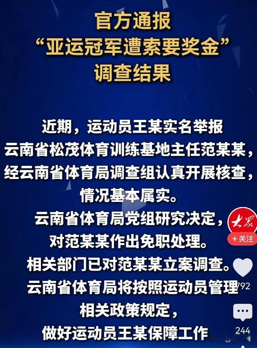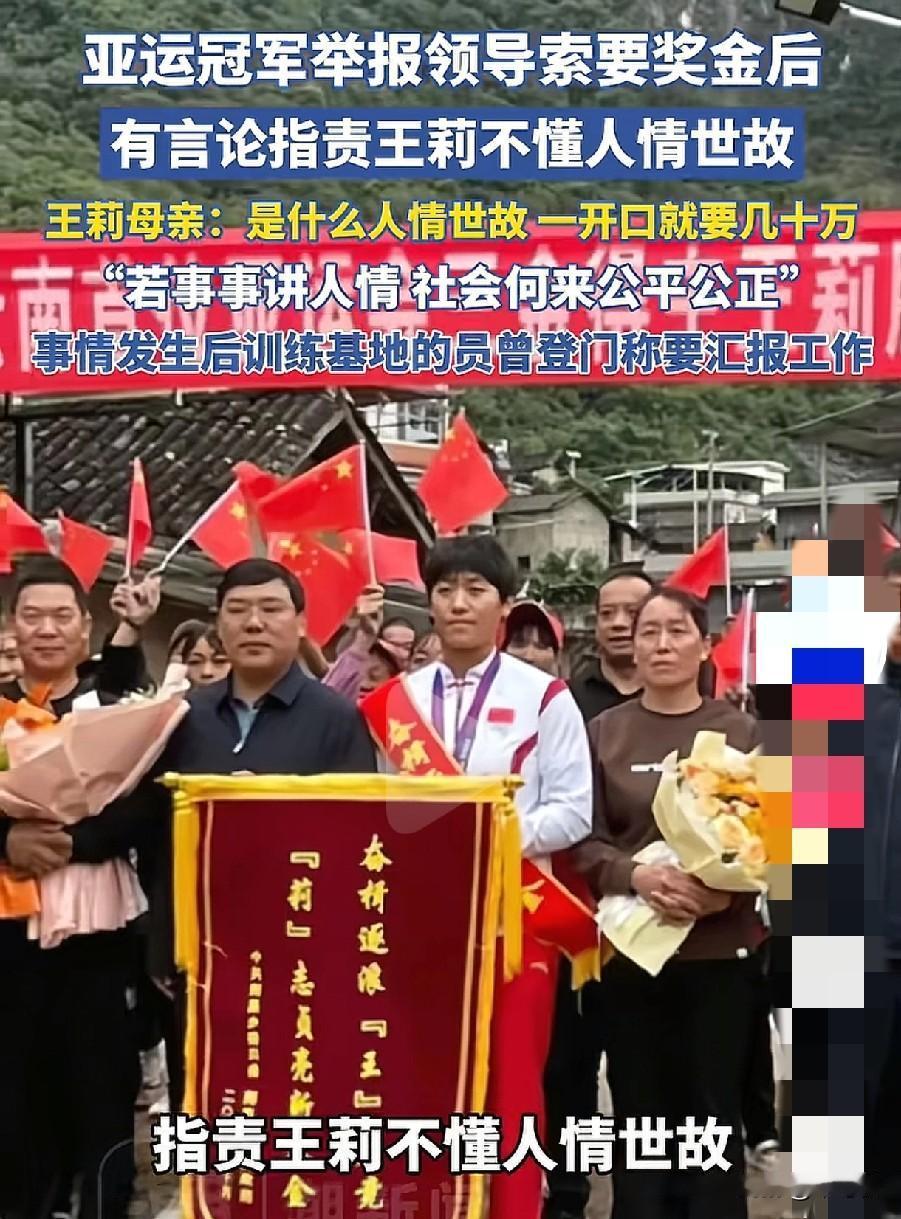 大快人心!运动员实名举报教练索要奖金15万后续来了,经调查,王莉举报的情况完全属实,涉事的范某某不仅被罢免职务,还被正式立案调查。 时间回到2025年12月,23岁的亚运三金得主王莉公开发声,揭开了自己在体育圈的遭遇。好不容易凭本事挣来的冠军奖金,最后要被教练伸手索取,理由是“没有我的推荐,你根本没机会参赛拿奖”,不给就变相让她退役。 王莉也是真刚!换别人可能怕被穿小鞋、影响前途,敢怒不敢言,可她偏不,直接实名举报,硬刚这种索取行为。 可事件发酵后,居然还有人跳出来指责王莉“不懂人情世故”,说教练这种索取就是圈子里的人情世故。照这个逻辑,那你上班挣的工资,是不是也该全交给领导?你也要懂人情世故啊。 但这事还没完,后续还有两个关键问题值得所有人关注,被盯上的15万奖金能不能全额退还?王莉的运动生涯能不能重回正轨?只有这两个问题得到妥善解决,这场维权才算真正画上圆满的句号,才算真正守住了体育圈的公平正义。 晒图笔记大赛 全运会王莉