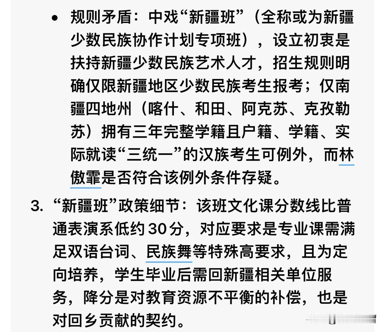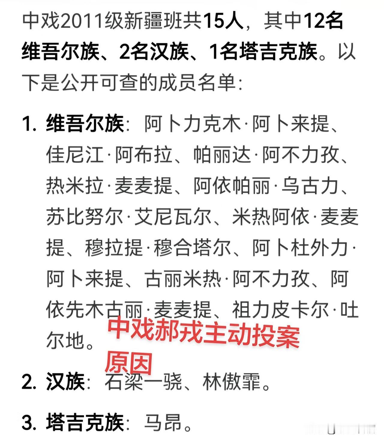 不得不承认,这届网友着实才华横溢,竟把闫学晶儿子林傲霏当年中戏新疆班的录取名单都查了出来。 名单显示,中戏2011级新疆班共录取新生15名,其中维吾尔族12名、塔吉克族1名、汉族两名,闫学晶儿子便是这两名汉族考生之一。 按照规定,中戏新疆班虽比普通班录取分数低30分,但需满足双语台词、民族舞等严苛要求。不知闫学晶儿子是会跳新疆舞,还是能流利使用少数民族语言? 对此,大家看法如何?欢迎在评论区交流。 (图片来源网络)