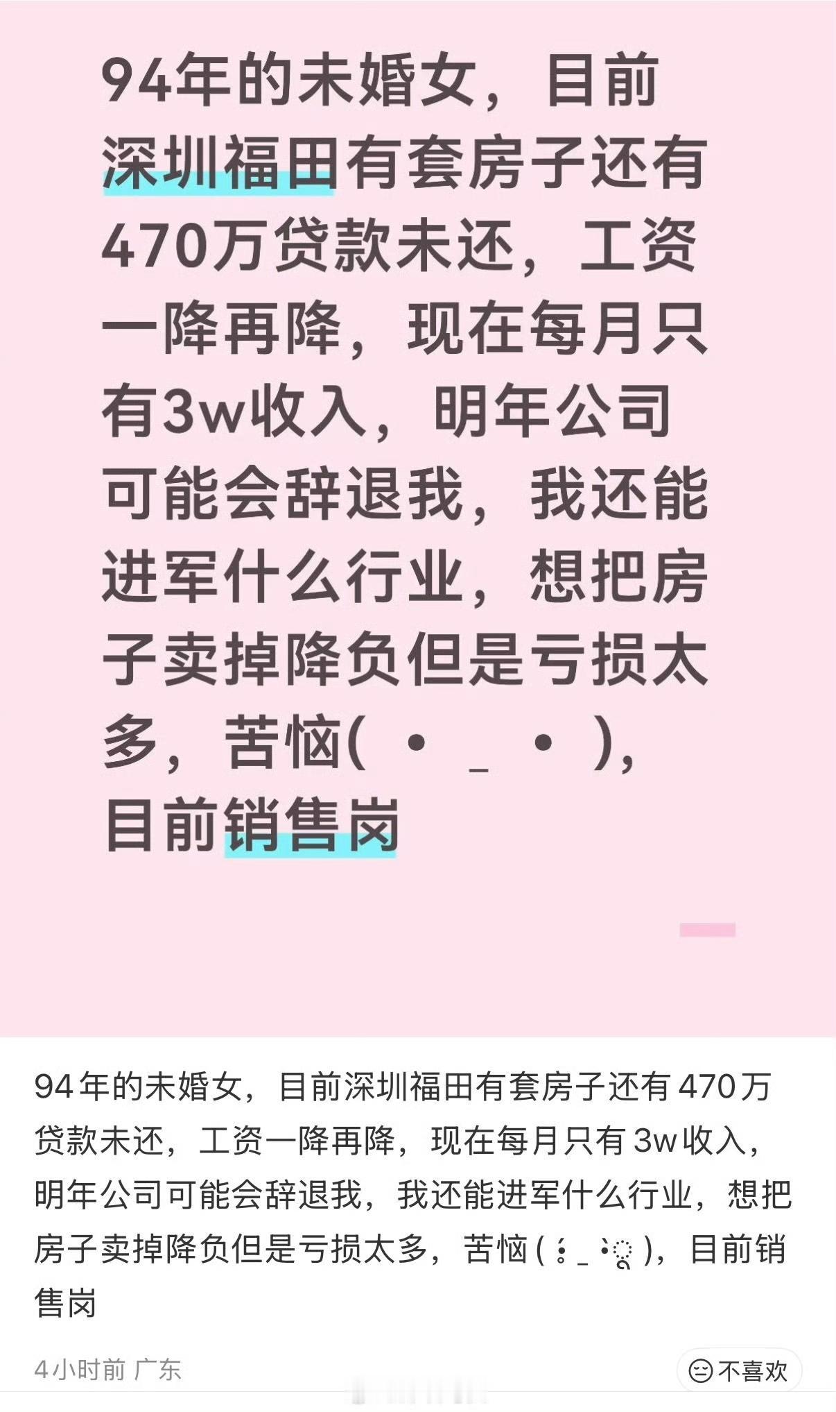 深圳94年的未婚女面临失业,房贷还有470万,悲催啊。在某公司做销售,之前月薪5-6万,在房价高峰买了一套房子,月供2-3万。谁能想到收入在降,房价在降,双降的打击,人简直要抑郁。如果现在止损卖掉房子,可能要打骨折,还完房贷,就是负数,心有不甘。但是公司效益不好,随时有被裁员的可能,下一份工作难找。失业