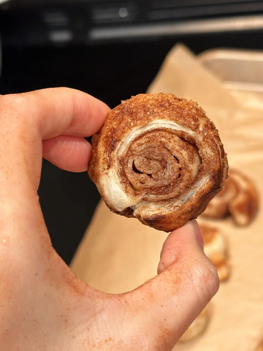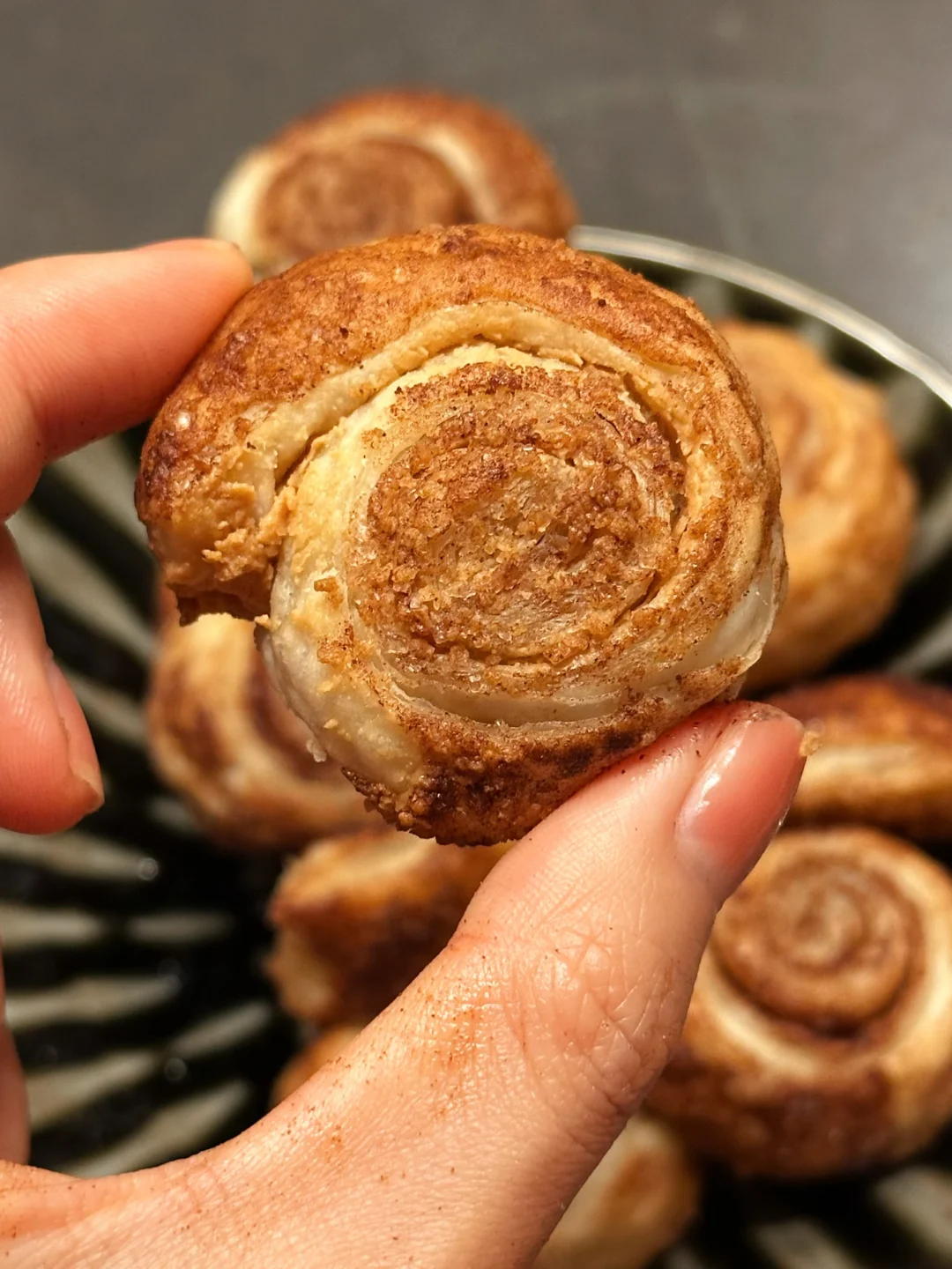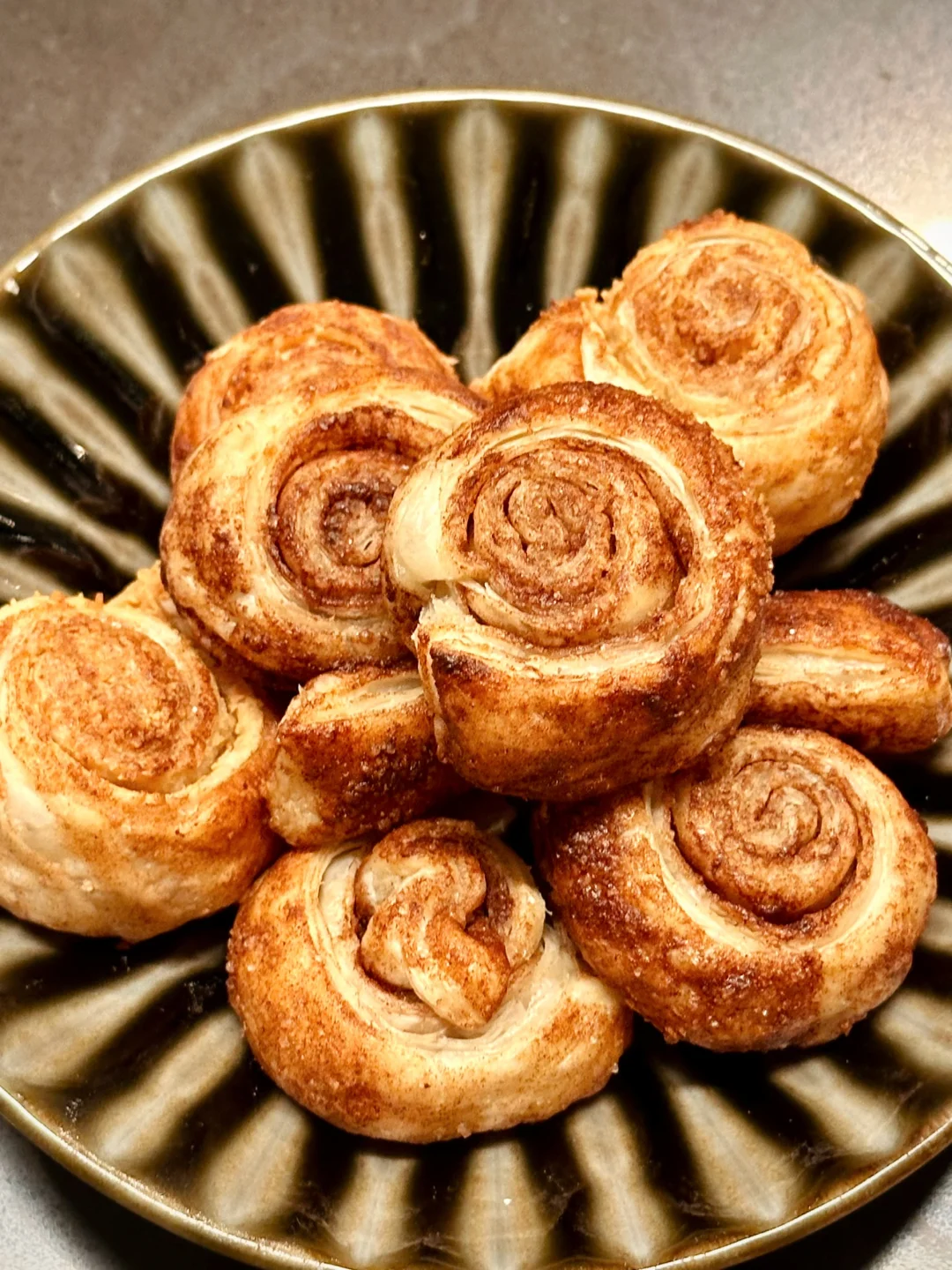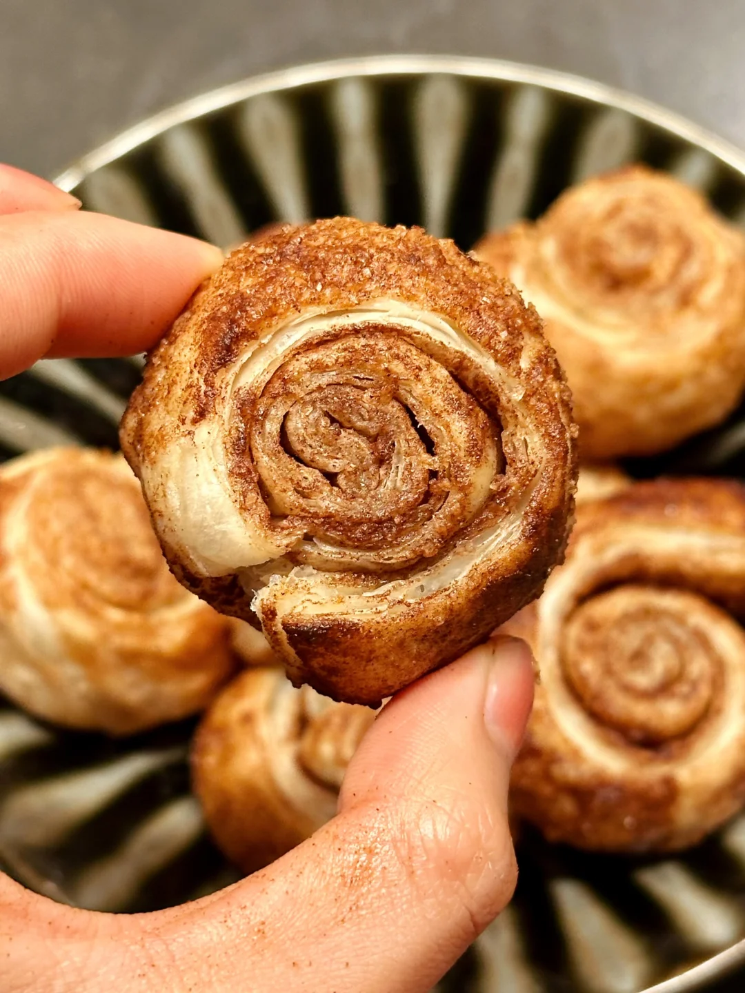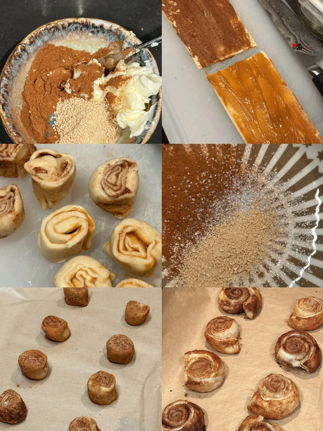 大部分网上看到的版本都是用吐司擀平做的肉桂卷面包体,但我决定做成了酥皮的形式:黄油香气更加浓郁,和肉桂糖一块儿闻着特别温暖治愈。而且口感酥松轻盈,一次吃一小块满腹又没负担!
