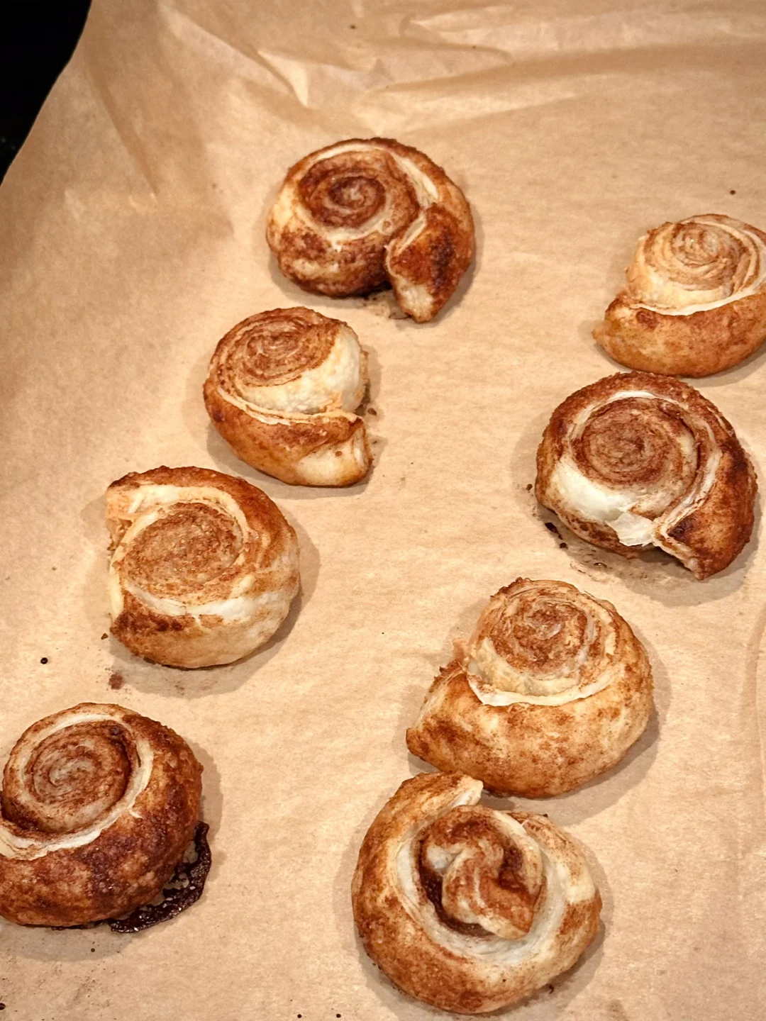 所有肉桂卷胚切面朝上,放在铺了油纸的烤盘上,记得每块之间有一点间隔,烤箱365F烤12分钟左右,就完成啦!