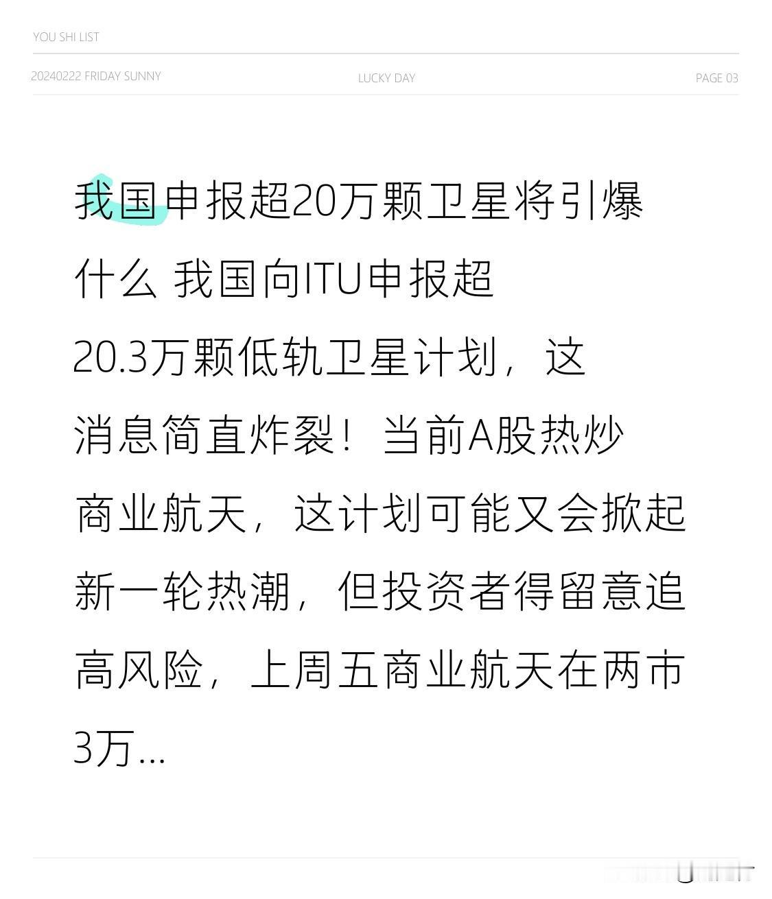 我国申报超20万颗卫星将引爆什么 我国向ITU申报超20.3万颗低轨卫星计划,这消息简直炸裂!当前A股热炒商业航天,这计划可能又会掀起新一轮热潮,但投资者得留意追高风险,上周五商业航天在两市3万亿成交额里占了7200多亿呢。 这次申报全是低轨卫星,它距地面近,信号“低时延、高带宽”,能支持手机直连等,发射和运维成本也低。马斯克的SpaceX星链已展示了低轨卫星威力,而我国在轨低轨卫星远少于美国,再不加速追赶差距会更大。而且低轨卫星资源有限,最多容纳10万颗。我国申报这么多,也是按规则抢位,给国内商业航天和卫星互联网打地基,看来是把星座互联网当成未来基础设施规划了。