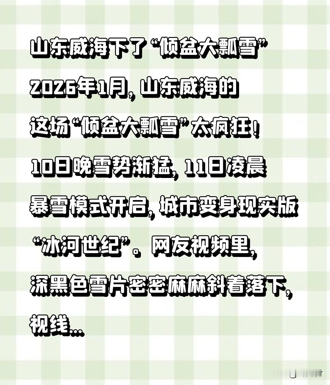 山东威海下了“倾盆大瓢雪” 山东威海降下“倾盆大瓢雪” 2026年1月,山东威海这场“倾盆大瓢雪”极为疯狂!10日晚,雪势逐渐增强,11日凌晨,暴雪模式正式开启,整座城市摇身一变,成了现实版的“冰河世纪”。 从网友拍摄的视频中可见,深黑色的雪片密密麻麻地斜着飘落,完全遮挡了视线,仿佛老天爷在向下倒雪一般。环翠区等核心区域的积雪厚度超过了20厘米,气象台紧急将预警升级为双橙色。 即便如此,凌晨时分,海边仍有不少游客前去打卡。然而,暴雪也给出行带来了麻烦,部分高速收费站关闭,公交线路进行了调整或停运。好在威海应对此类情况经验丰富,清雪人员和设备通宵作业,主干道基本保持畅通。 威海独特的“冷流降雪”使得这场雪如此“嚣张”,雪天出行时,大家可要像企鹅一样小步慢走。