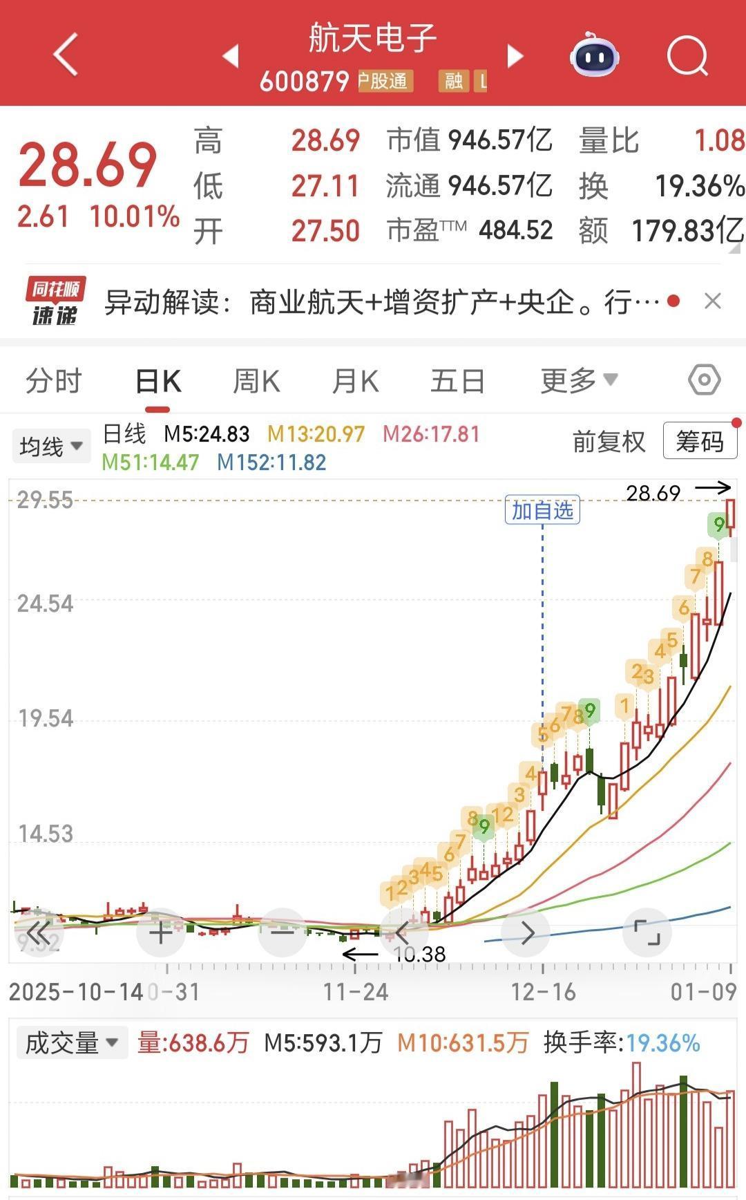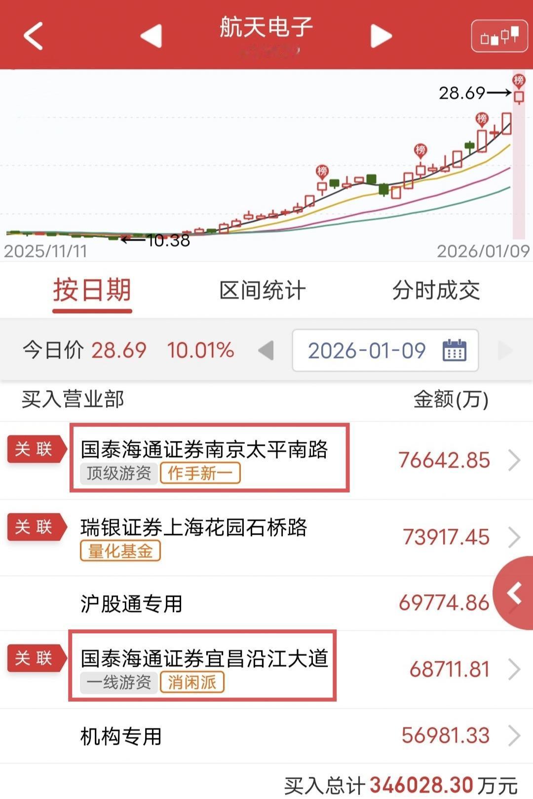 新一、消闲派爆买14.4亿: 周五航天电子上板后盘中炸板,最终尾盘封涨停。 盘后龙虎榜显示,作手新一爆买7.6亿,消闲派大买6.8亿,合计14.4亿。 最近,作手新一、消闲派火力猛开,梭哈猛干啊!