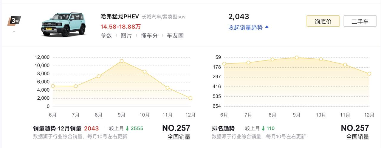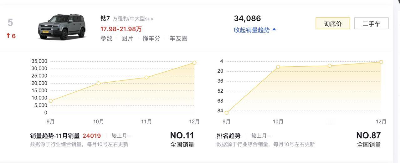 方程豹钛7的销量有点猛,但是猛 龙很受伤啊。。 12月方程豹钛7销量为34086辆,没有定语的销量第五名,比11月的销量高了一万辆左右。之前同样方盒子造型的猛 龙销量也不错,曾经在2025年9月卖出锅11141辆的好成绩,但是最近有点没落了。12月,燃油版加上PHEV版本,一共也就3800辆左右。。。【来自懂车帝车友圈】