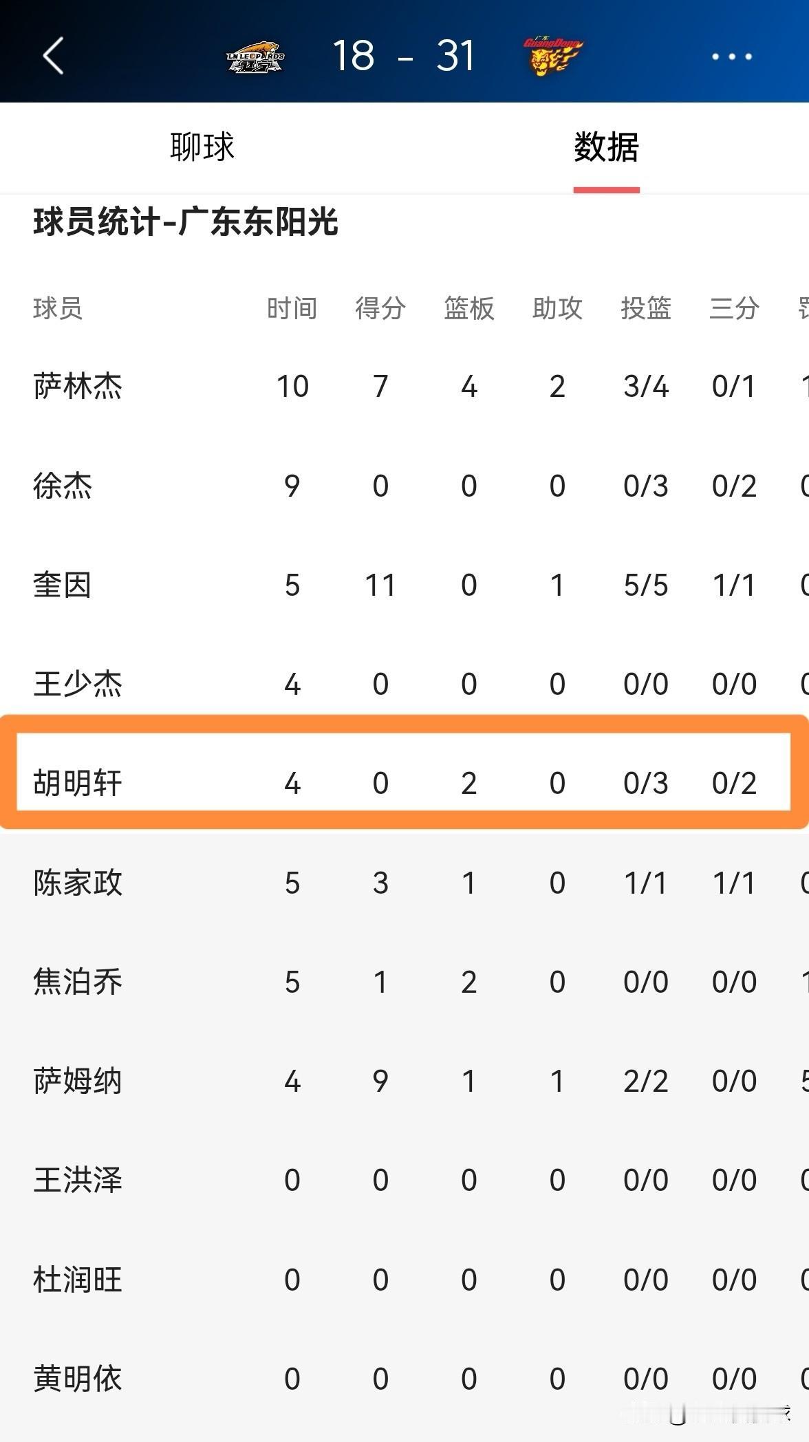 广东东阳光球星胡明轩真是太低迷了!在今天广东东阳光客场挑战辽宁本钢的比赛中,目前双方的首节比赛已经结束,广东东阳光暂时以31:18领先对手。在第一节比赛中,胡明轩继续像之前那样低迷,他在首发出战的4分钟里,投篮3中0,其中三分球2中0怒砍0分。 我真是太佩服胡明轩了,他竟然能够在低迷的道路上如此的稳定。
