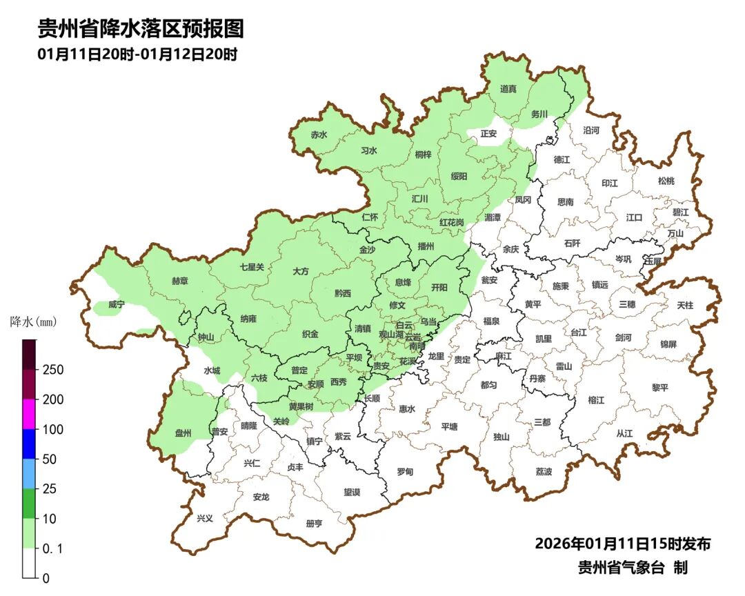 1月10日08时至11日08时,中雨出现在毕节市的赫章县哲庄(雨量为12.0毫米),小雨有1130个观测站。毕节市的威宁,遵义市的习水等2个县最低气温在0℃及以下,最低气温威宁-1.0℃。此外,六盘水市的盘州,贵阳市的开阳,遵义市的仁怀、余庆、务川、播州、正安、湄潭、道真,铜仁市的印江、德江、思南、江口、沿河、玉屏、石阡、碧江,黔东南州的三穗、岑巩、锦屏、麻江,黔西南州的普安22县(市、区)出现大雾,最低能见度为正安县54.0米。宝子们!