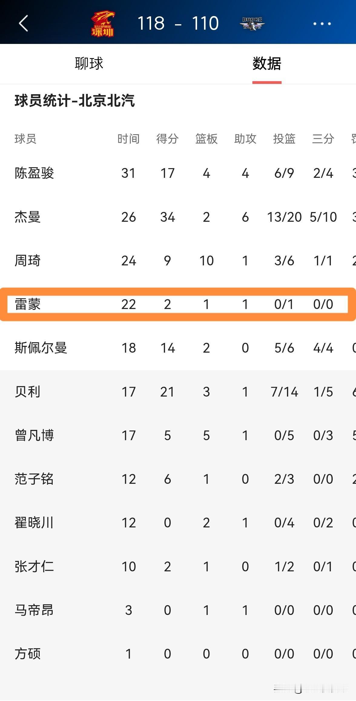 我强烈建议北京北汽大将雷蒙增加自己的出手数!在今天北京北汽客场以110:118不敌深圳马可波罗的比赛中,雷蒙在首发出战的22分钟里,竟然只出手了1次,依靠罚球得到2分,还有1篮板1助攻1抢断,他的场上正负值为-6。 作为北京北汽在外线的主要得分点之一,雷蒙必须要在接下来的比赛中增加自己的出手数,雷蒙必须相信自己的外线投射能力才行。