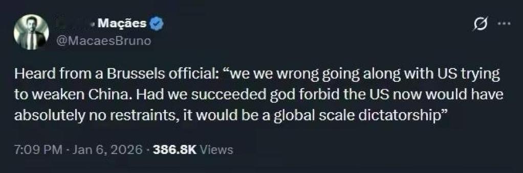 欧洲官员:如果我们支持美国削弱中国成功了,美国将是一个全球范围的独裁政权。 这