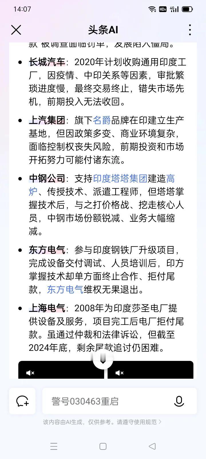 印度想恢复中企参与政府招标资格 专家提醒中企高度警惕落入陷阱 去年底海尔被迫把印度子公司的控股权出售给印度和美国买家,这是印度对中企的又一次收割! 多年来许多中国先进大型企业都遭到了印度的技术白嫖和经济收割,给国家安全和经济利益造成了极其严重的损失! 外资坟场印度简直就是中企的噩梦! 中钢公司帮助印度塔塔集团建设最先进的炼钢高炉并且传授核心技术,结果丢失了产品的印度市场。 东方电气、上海电气分别为印度建设钢铁和发电机组,结果被对方吃了霸王餐! 保变电气被迫贱卖印度子公司,而且丧失了特高压变压器核心技术,真是赔了夫人又折兵! 上汽集团和长城汽车投资印度,最终也都前功尽弃了。 时隔五年,印度突然放风说要重新允许中企参与其政府项目竞标,恐怕是又想诈骗中企了。 希望国家能够严格管理中企对于印度的高科技和经济出口,切实保护国家安全和经济利益!