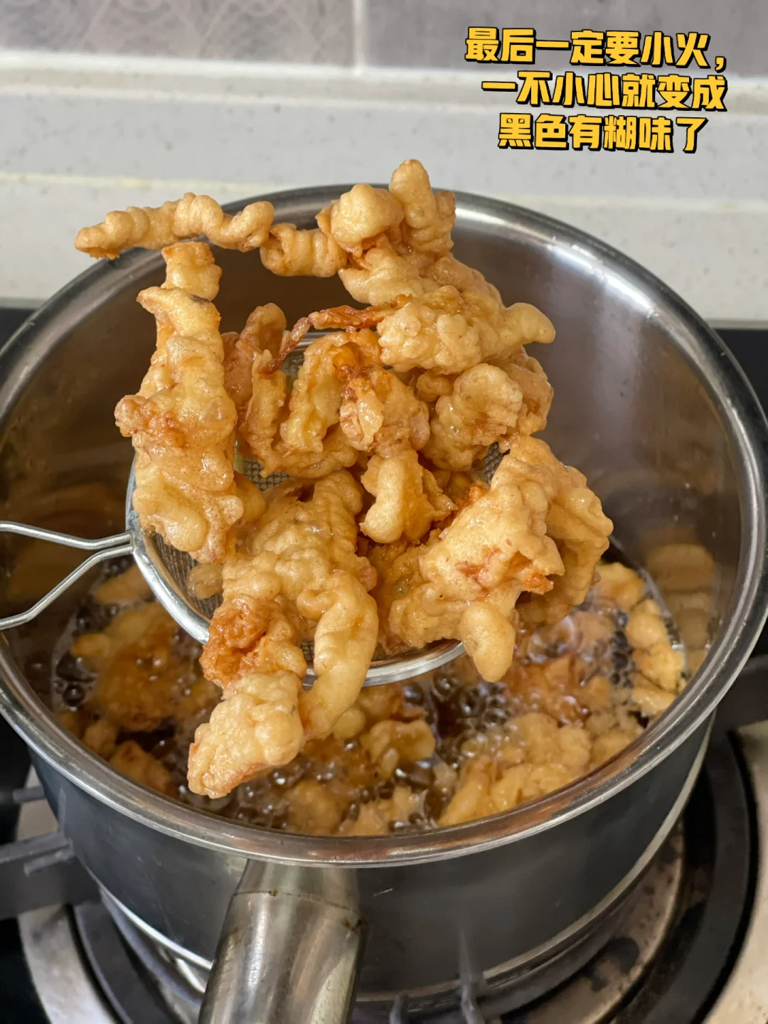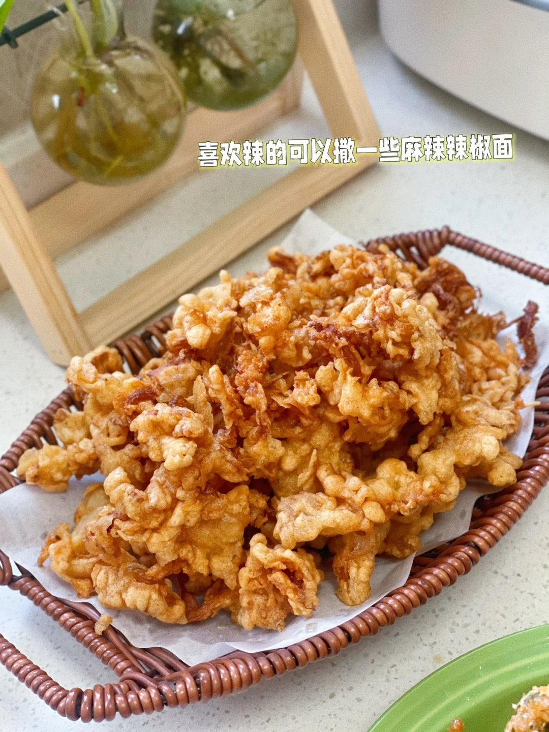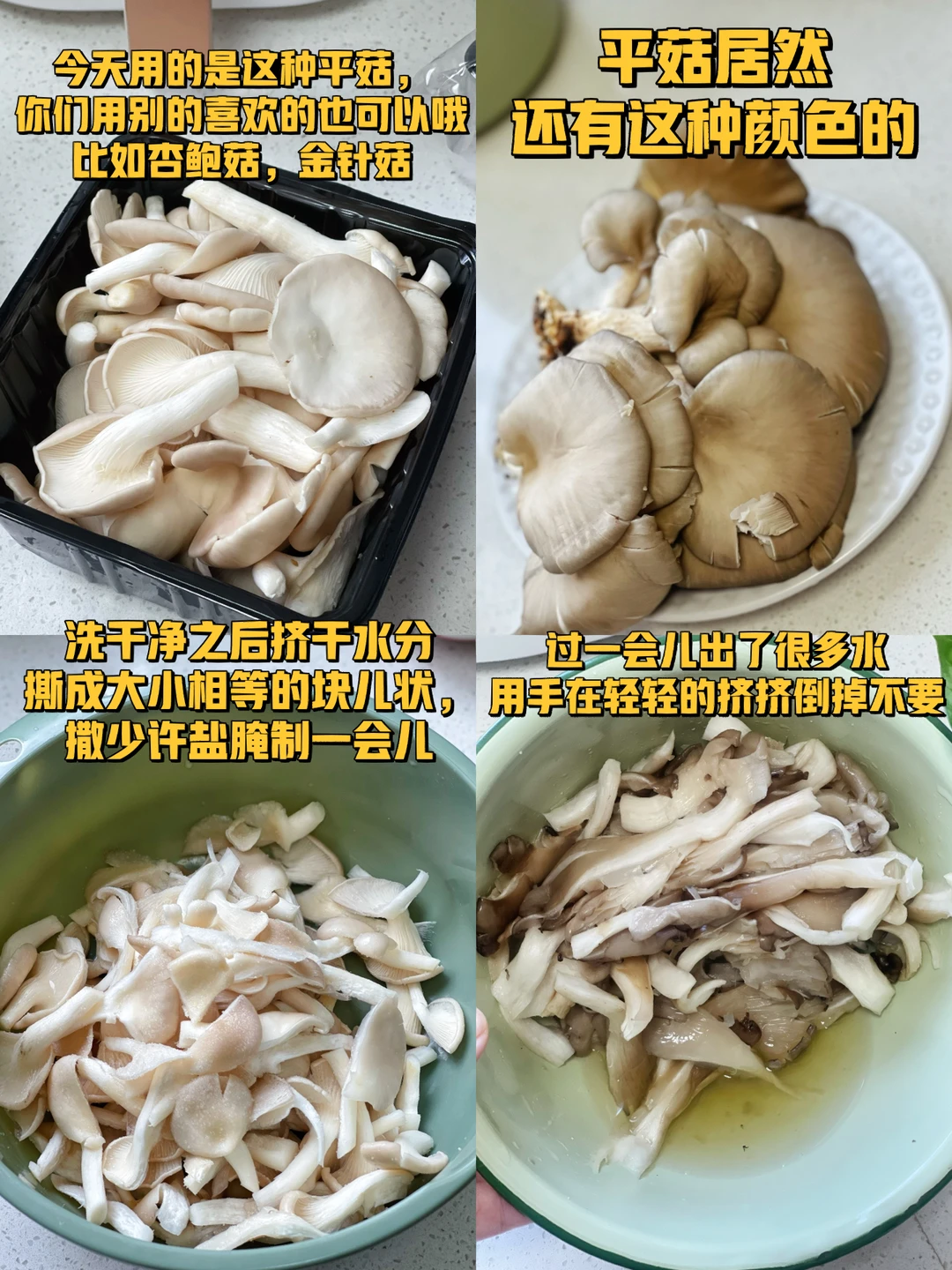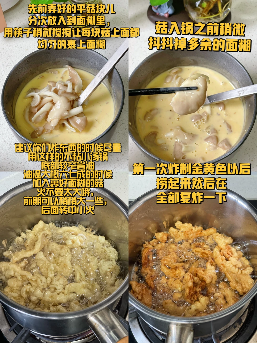 有一次我们去素食馆吃饭,点了一道炸香菇来了之后居然一点都不酥脆有点瘪掉了然后我就说还不如我自己做的好吃呢,回家以后这事儿就忘记了,后面买菜的时候偶然看见平菇就想起来这事儿了,说做就做吧,果然还是自己做的料更足 前期刚炸的时候你们火要大一些,后面开始慢慢成型了,再把火稍微小一点,不然很容易外面炸糊了里面还没熟 1. 今天用的是这种平菇,你们用别的喜欢的也可以哦比如杏鲍菇,金针菇 2. 洗干净之后挤干水分撕成大小相等的块儿状,撒少许盐 3. 过一会儿出了很多水用手在轻轻的挤挤倒掉不要 4. 按面粉,玉米淀粉2:1的比例放入一个大碗里 打入两个鸡蛋。这样炸出来会更酥脆 5. 加入盐盐,胡椒粉,鸡粉,糖 6. 用筷子搅匀之后,然后我还用过滤网 过滤了一下,这样会更细腻,没有面疙瘩 7. 这样看起来会更细腻,也不能太稀平菇会挂不住面糊哦 8. 先前弄好的平菇块儿分次放入到面糊里,用筷子稍微搅搅让每块菇上面都均匀的裹上面糊 9. 菇入锅之前稍微抖抖掉多余的面糊 10. 建议你们炸东西的时候尽量用这样的不粘小汤锅底部较窄省油油温大概六七成的时候加入裹好面糊的菇火不要太大哦,前期可以稍稍大一些,后面转中小火 11. 第一次炸制金黄色以后捞起来然后在全部复炸一下 12. 最后一定要小火,一不小心就变成黑色有糊味了