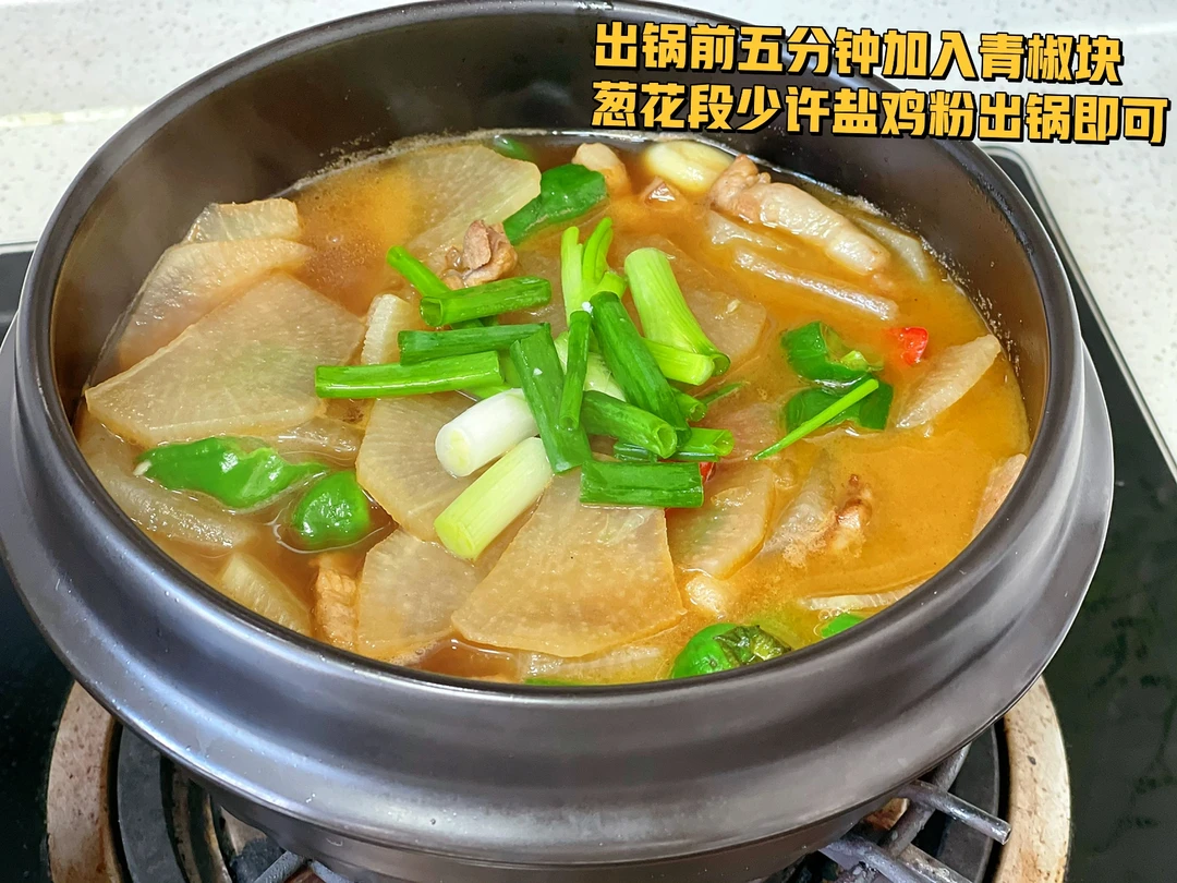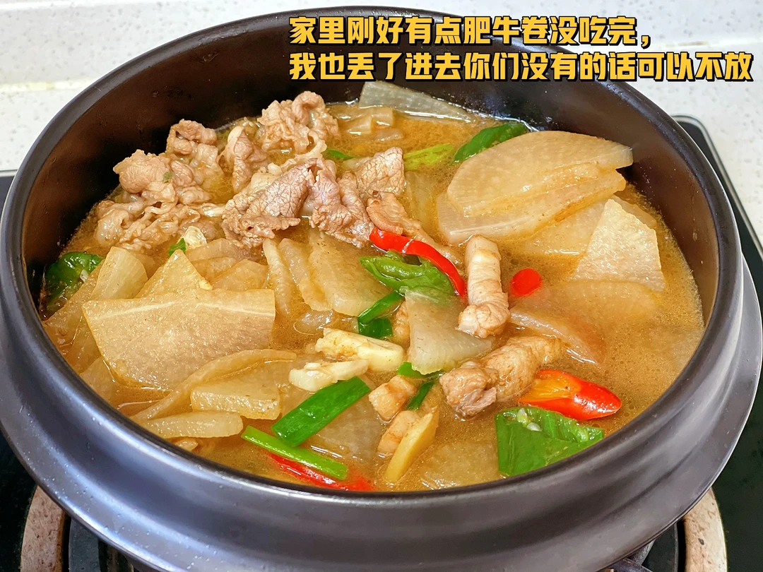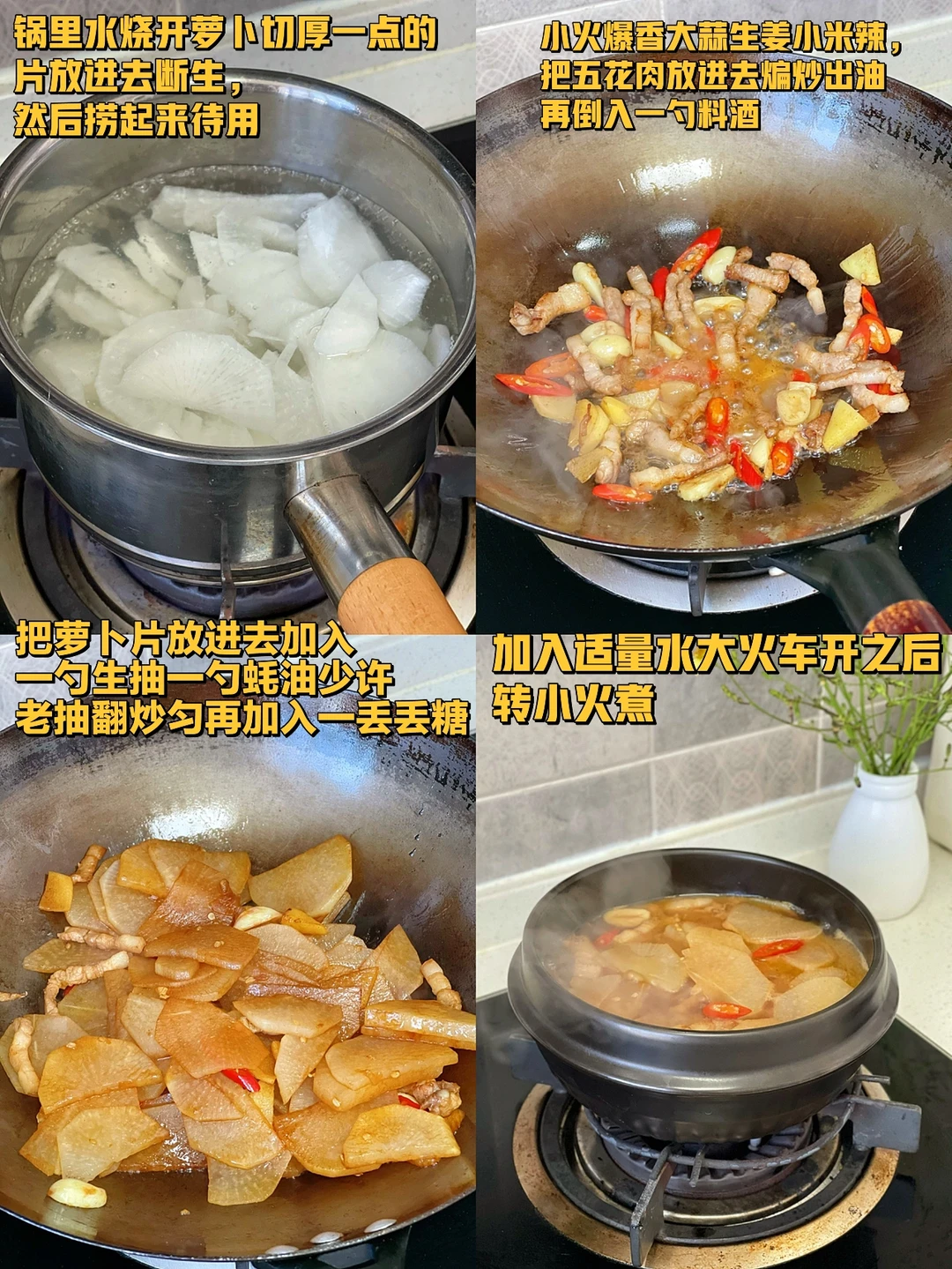 1. 锅里水烧开萝卜切厚一点的片放进去断生,然后捞起来待用 2. 小火爆香大蒜生姜小米辣,把五花肉放进去煸炒出油再倒入一勺料酒 3. 把萝卜片放进去加入一勺生抽一勺蚝油少许老抽翻炒匀再加入一丢丢糖 4. 加入适量水大火车开之后转小火煮 5. 出锅前五分钟加入青椒块葱花段少许盐鸡粉出锅即可 6. 家里刚好有点肥牛卷没吃完,我也丢了进去你们没有的话可以不放 平菇青菜: 1. 小火爆香大蒜生姜沫干辣椒平菇丢进去翻炒两三分钟加入一勺薄盐生抽 2. 青菜放进去转大火翻炒加入适量盐鸡粉出锅即可