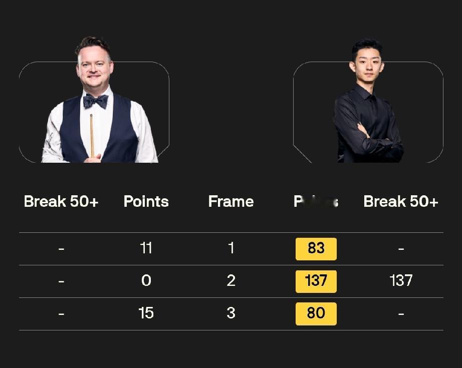 吴宜泽 3-0 肖恩·墨菲 1月11日,2025/2026赛季斯诺克大师赛拉开战幕。揭幕战吴宜泽对阵卫冕冠军肖恩·墨菲,11局6胜赛制。 吴宜泽状态不错,第二局轰出单杆137分,3-0领先肖恩·墨菲。