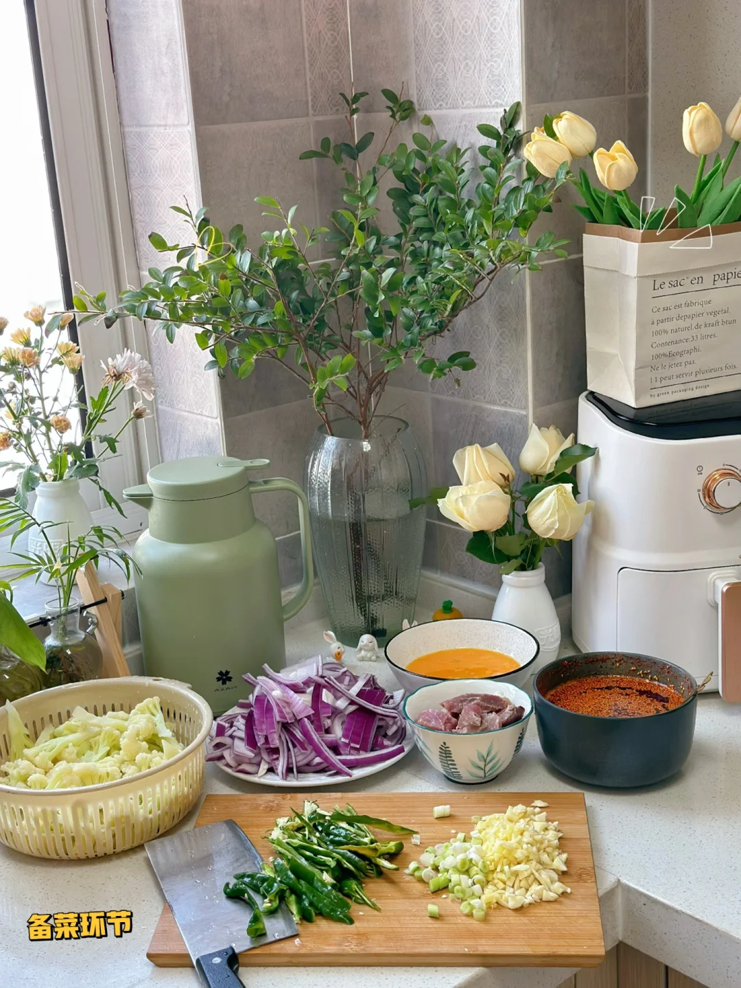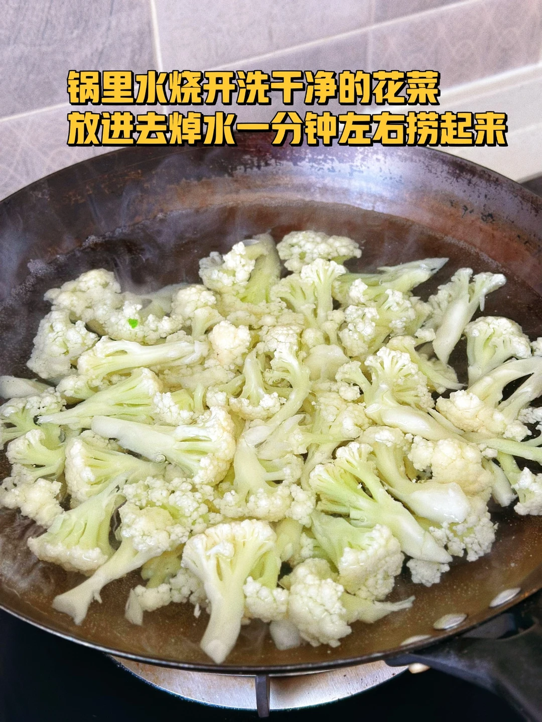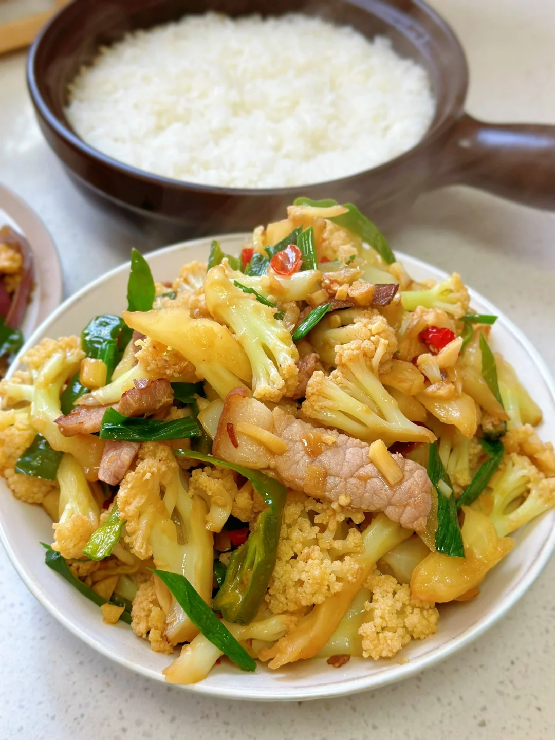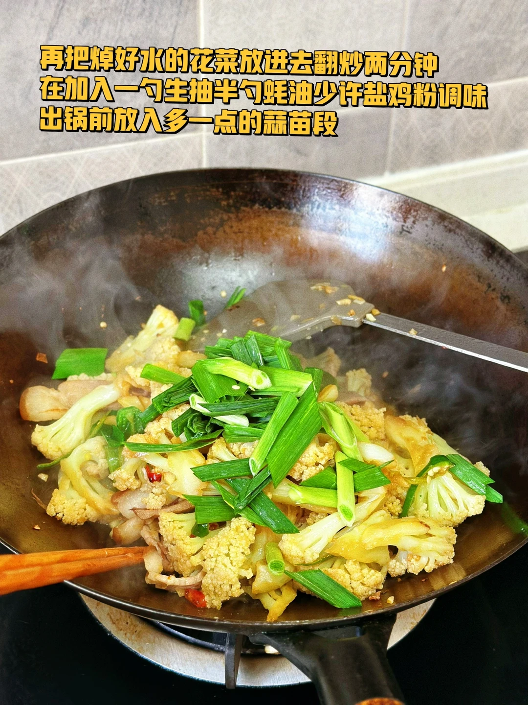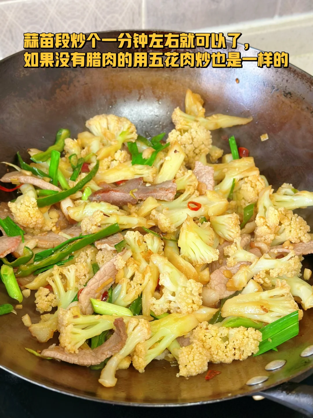 如果吃腻了干锅花菜的亲们家里刚好有腊肉的,可以试一下这个做法,花菜吸收了腊肉的香气很下饭,而且做法很简单 1. 小火爆香大蒜生姜干辣椒碎,再把切好的腊肉放进去一起炒会儿 2. 再把焯好水的花菜放进去翻炒两分钟在加入一勺生抽半勺蚝油少许盐鸡粉调味出锅前放入多一点的蒜苗段 3. 蒜苗段炒个一分钟左右就可以了,如果没有腊肉的用五花肉炒也是一样的 花菜吸收了腊肉的香味很好吃,可以多放一点辣椒哦