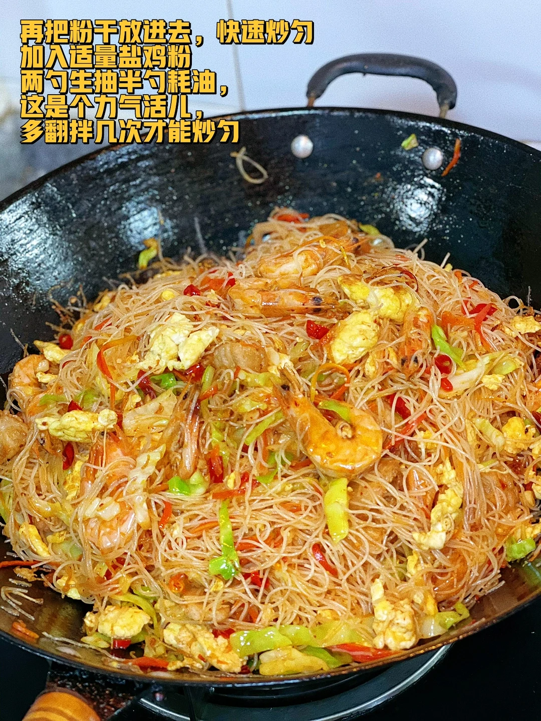 8. 再把粉干放进去,快速炒匀加入适量盐鸡粉两勺生抽半勺耗油,这是个力气活儿,多翻拌几次才能炒匀