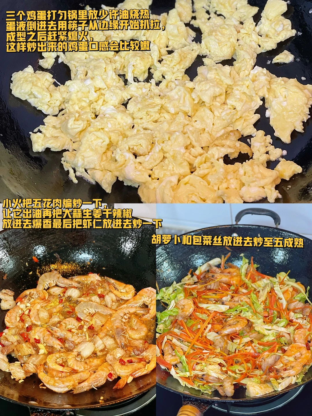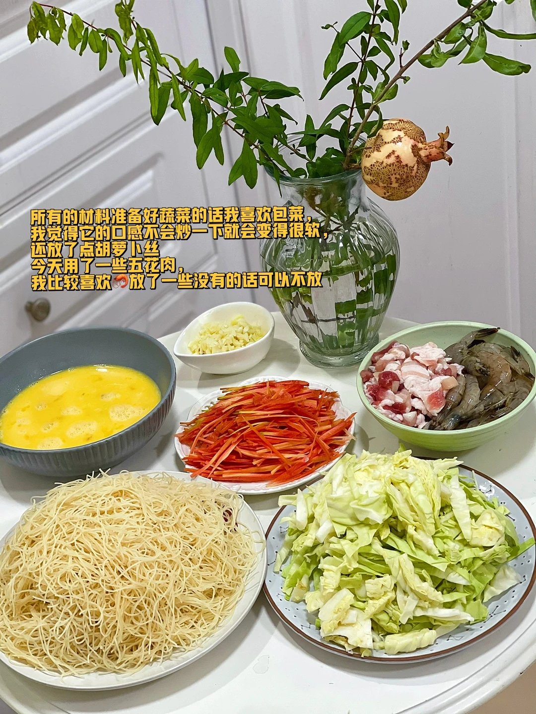 1. 所有的材料准备好蔬菜的话我喜欢包菜,我觉得它的口感不会炒一下就会变得很软,还放了点胡萝卜丝今天用了一些五花肉,我比较喜欢🦐放了一些没有的话可以不放