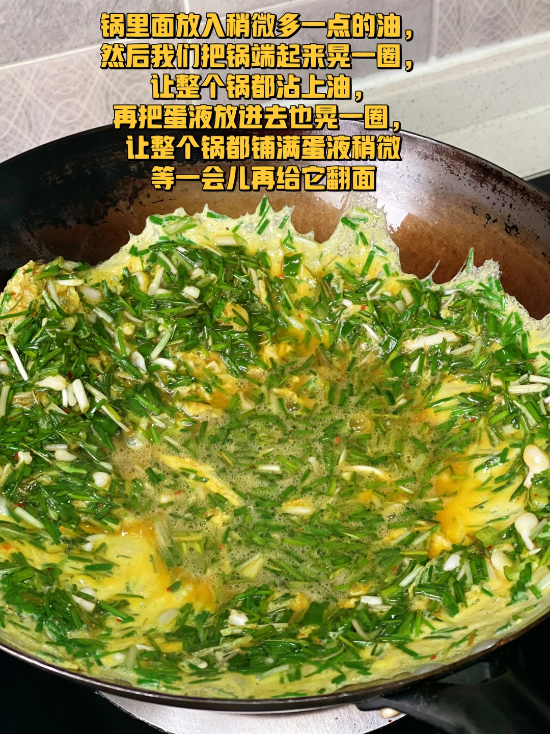 5. 锅里面放入稍微多一点的油,然后我们把锅端起来晃一圈,让整个锅都沾上油,再把蛋液放进去也晃一圈,让整个锅都铺满蛋液稍微等一会儿再给它翻面