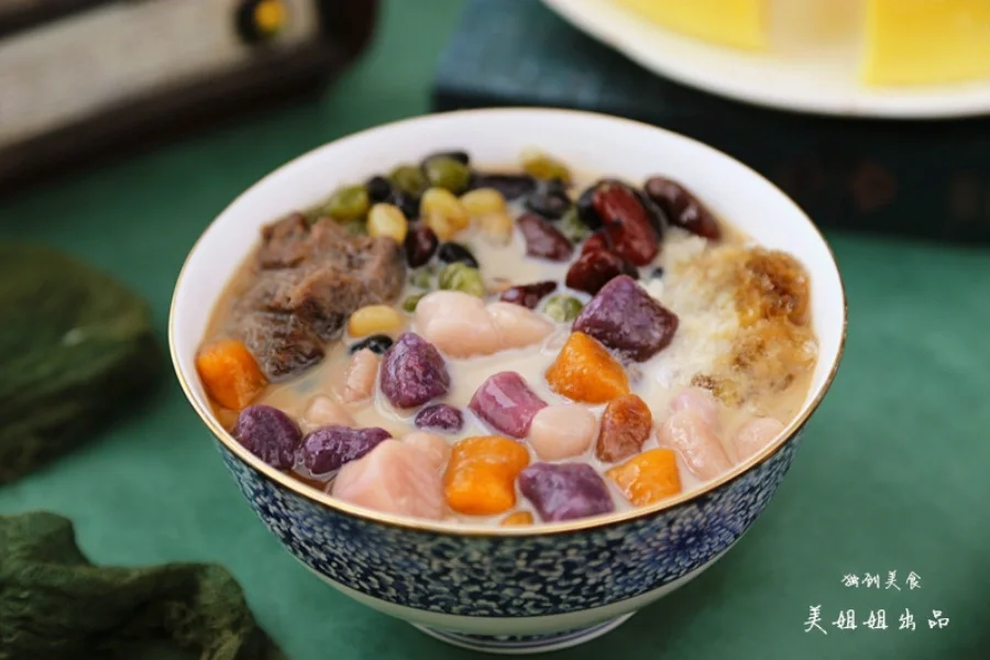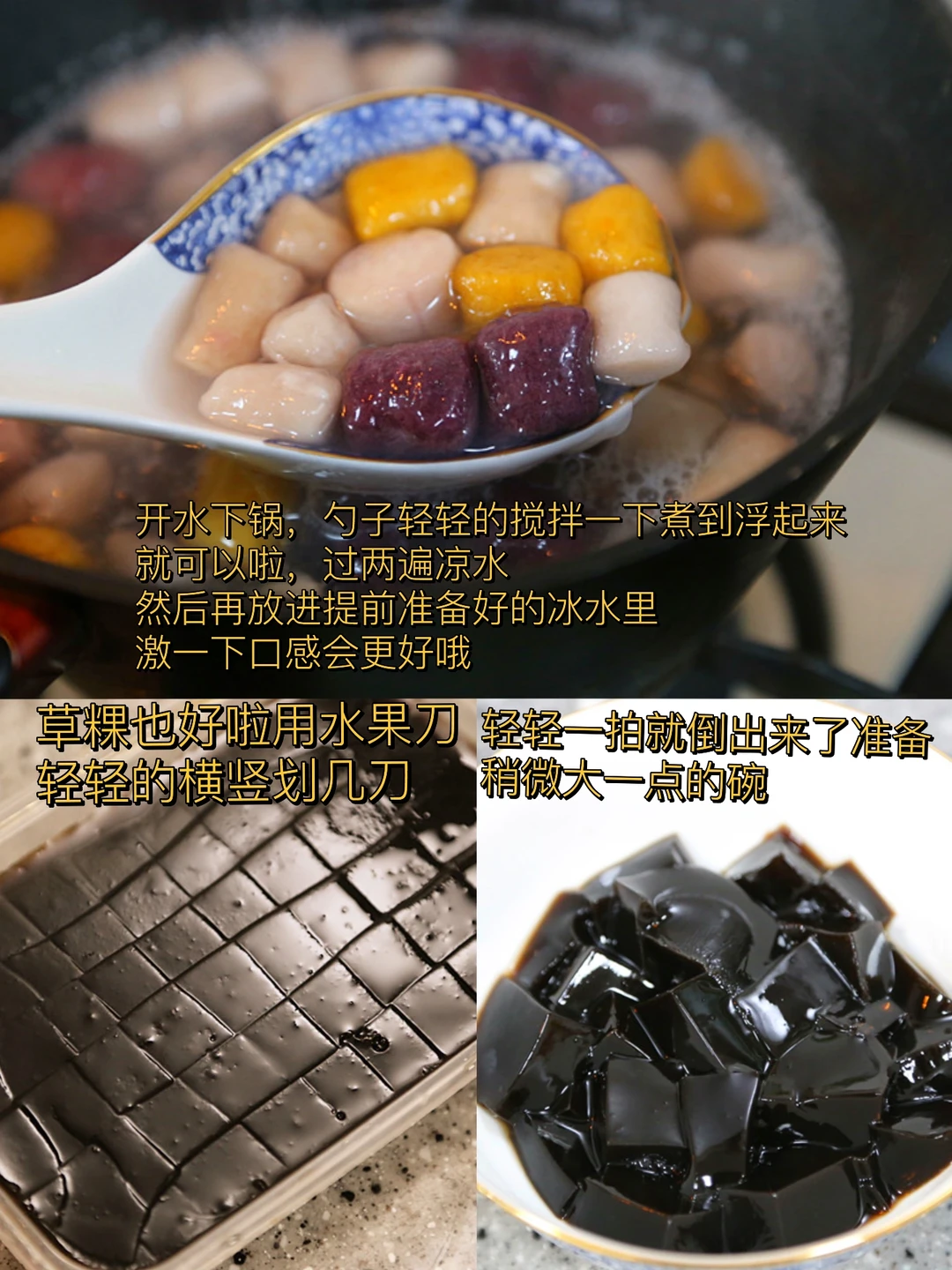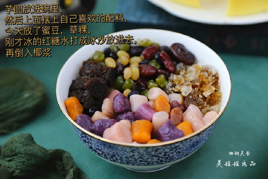 16. 芋圆放进碗里,然后上面摆上自己喜欢的配料,今天放了蜜豆,草粿,刚才冰的红糖水打成冰沙放进去,再倒入椰浆