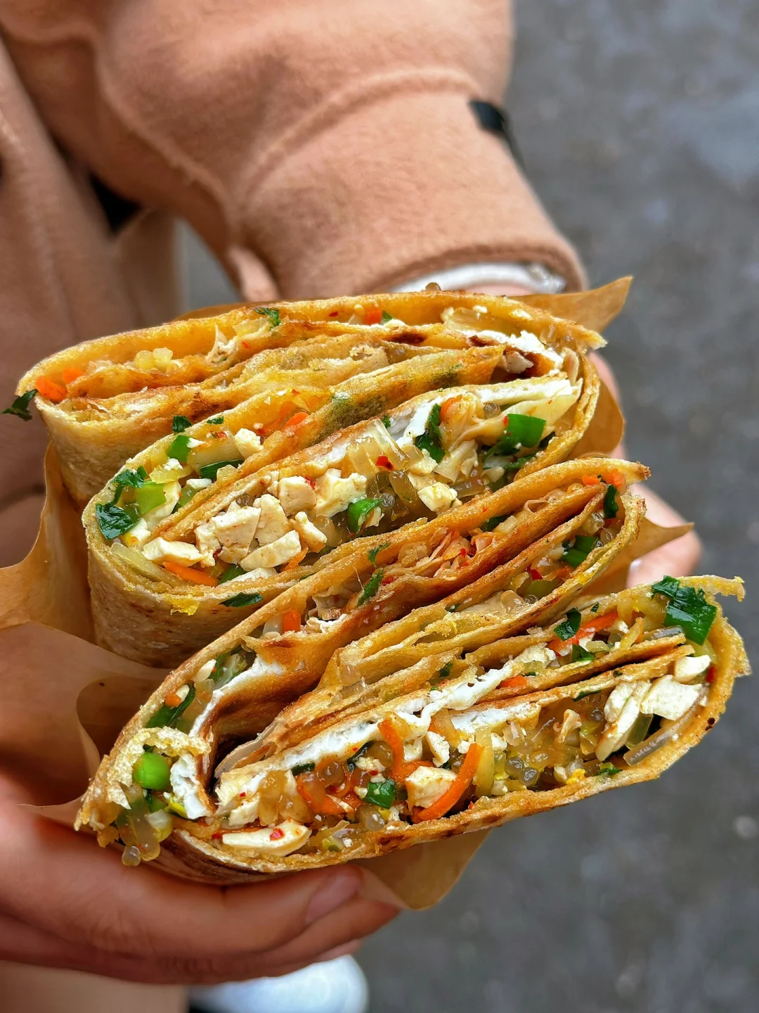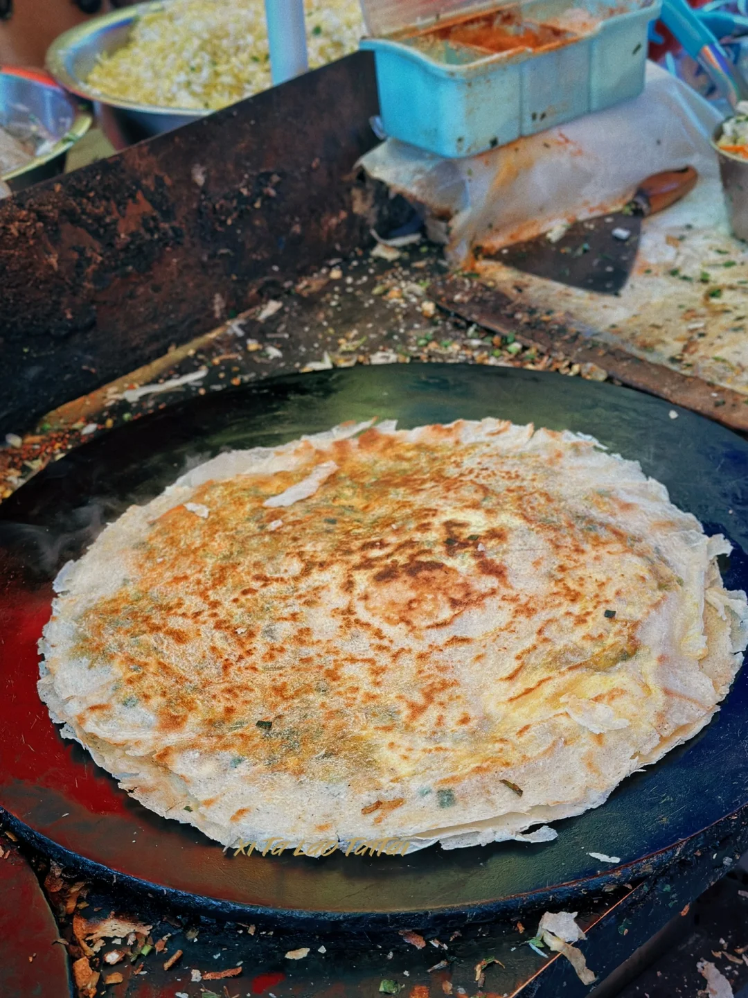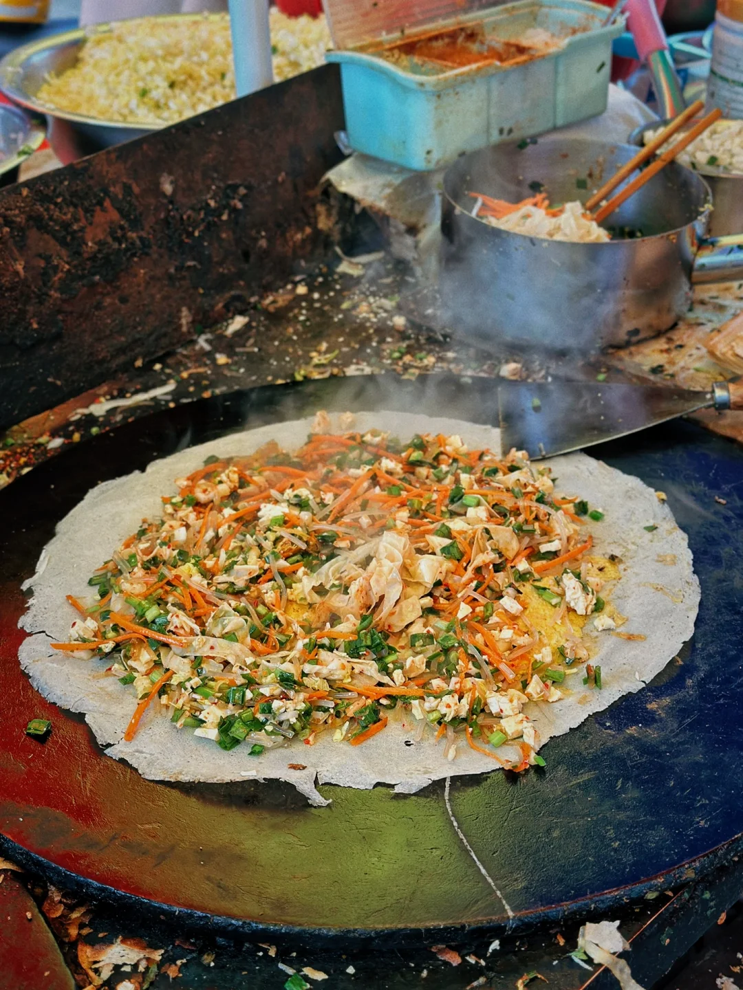 好喜欢吃这个饼,每次去菜市场买菜的时候只要这个阿姨在肯定去买一个六块钱一个,后来八块到现在的十块感觉什么都在涨,唯独工资没有涨 我喜欢在里面放土豆丝粉条,豆腐,糯糯的能吃辣的多放一点辣椒哦,趁热吃烫烫的脆脆的 不过貌似好多地方都有这个饼呢