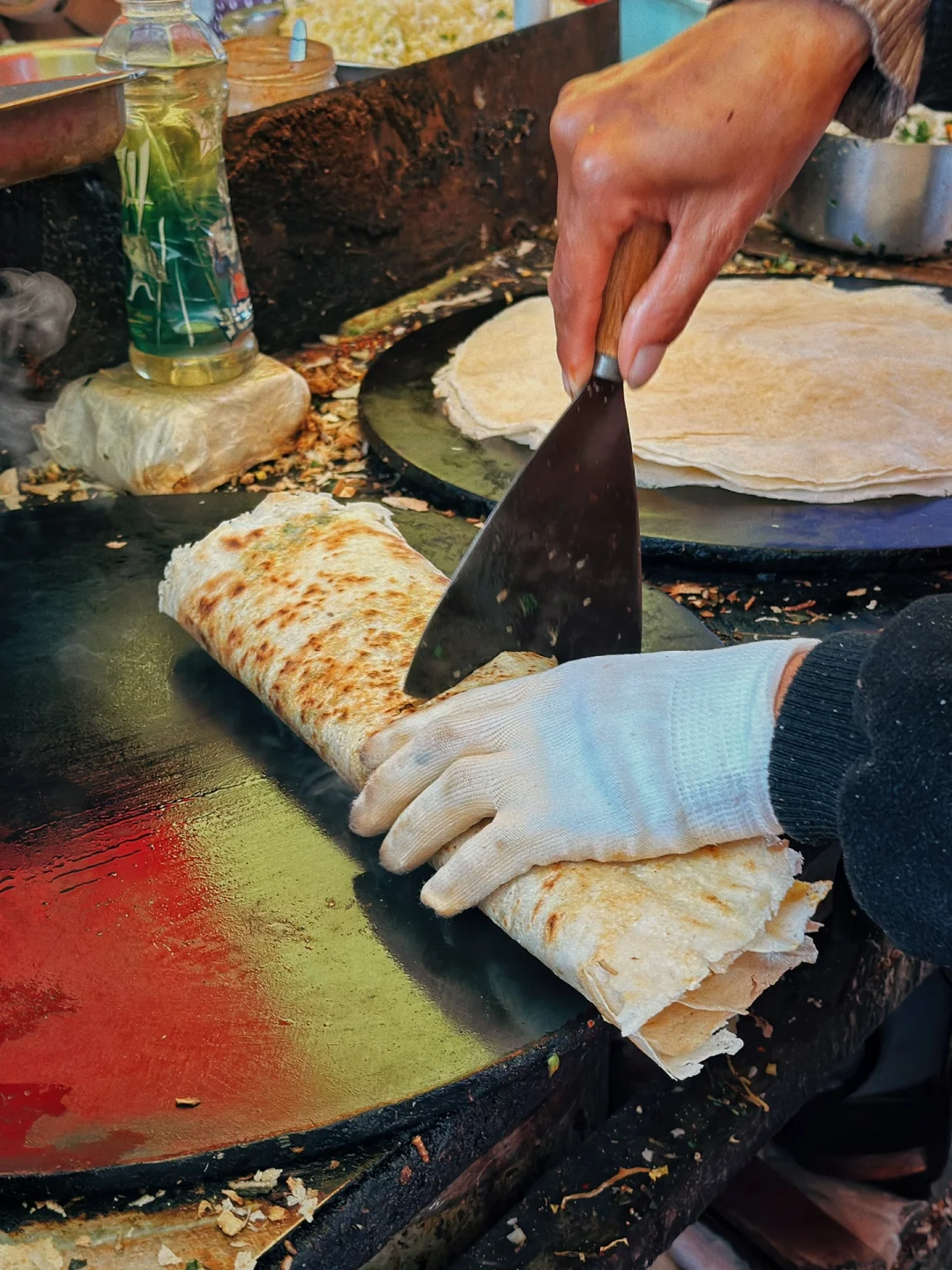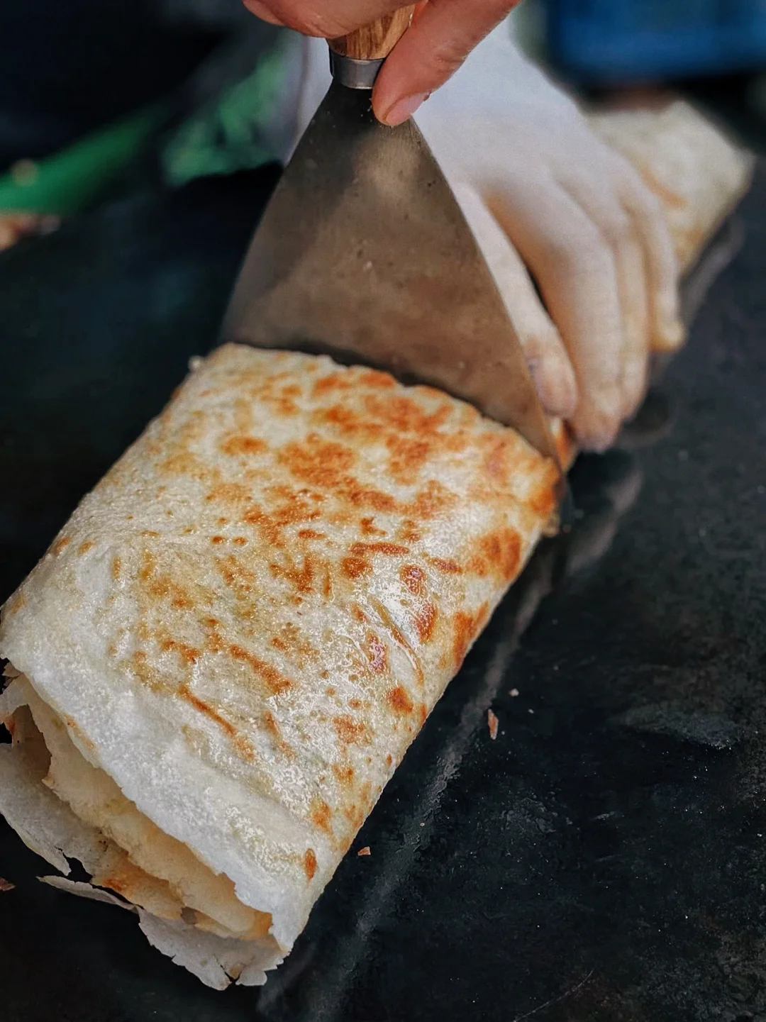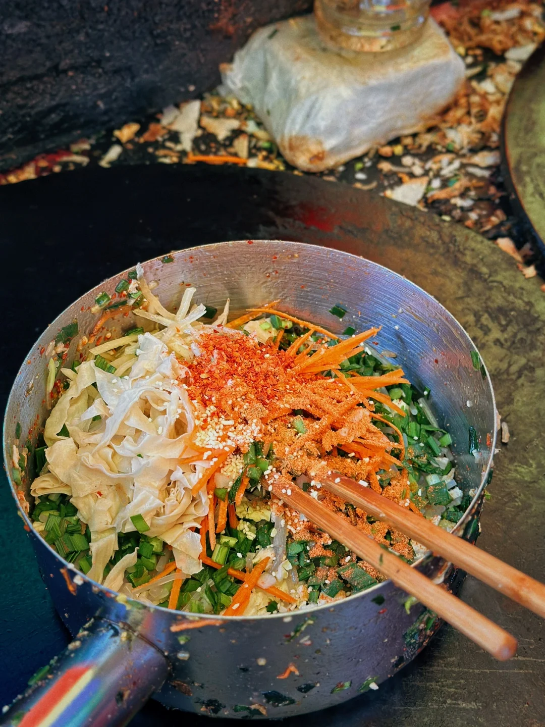 好喜欢吃这个饼,每次去菜市场买菜的时候只要这个阿姨在肯定去买一个六块钱一个,后来八块到现在的十块感觉什么都在涨,唯独工资没有涨 我喜欢在里面放土豆丝粉条,豆腐,糯糯的能吃辣的多放一点辣椒哦,趁热吃烫烫的脆脆的 不过貌似好多地方都有这个饼呢