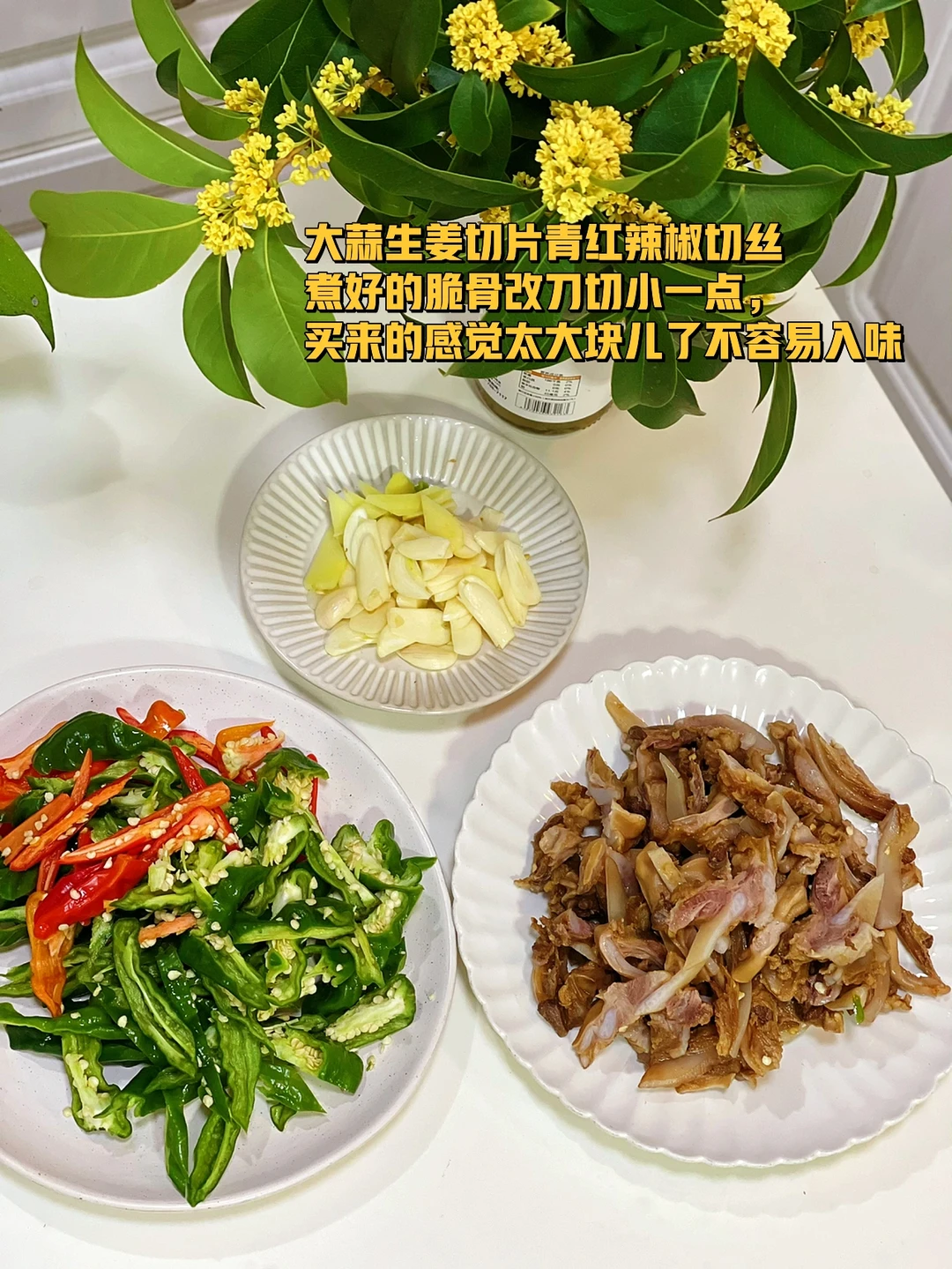 5. 大蒜生姜切片青红辣椒切丝煮好的脆骨改刀切小一点,买来的感觉太大块儿了不容易入味