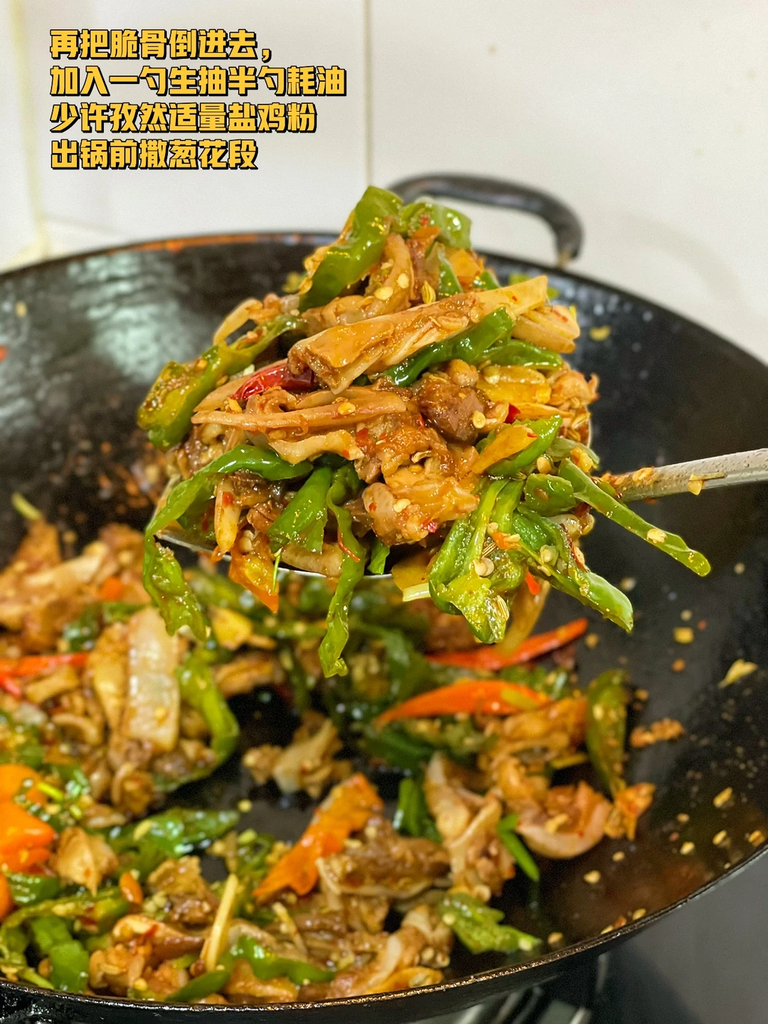 7. 再把脆骨倒进去,加入一勺生抽半勺耗油少许孜然适量盐鸡粉出锅前撒葱花段