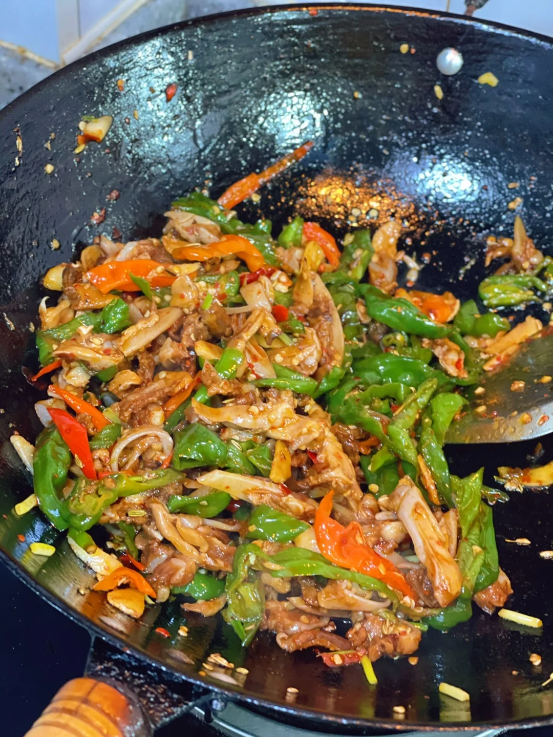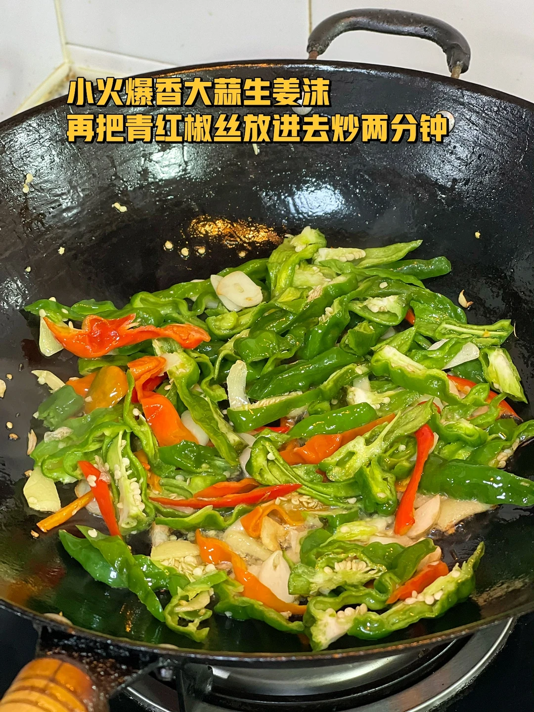 6. 小火爆香大蒜生姜沫再把青红椒丝放进去炒两分钟