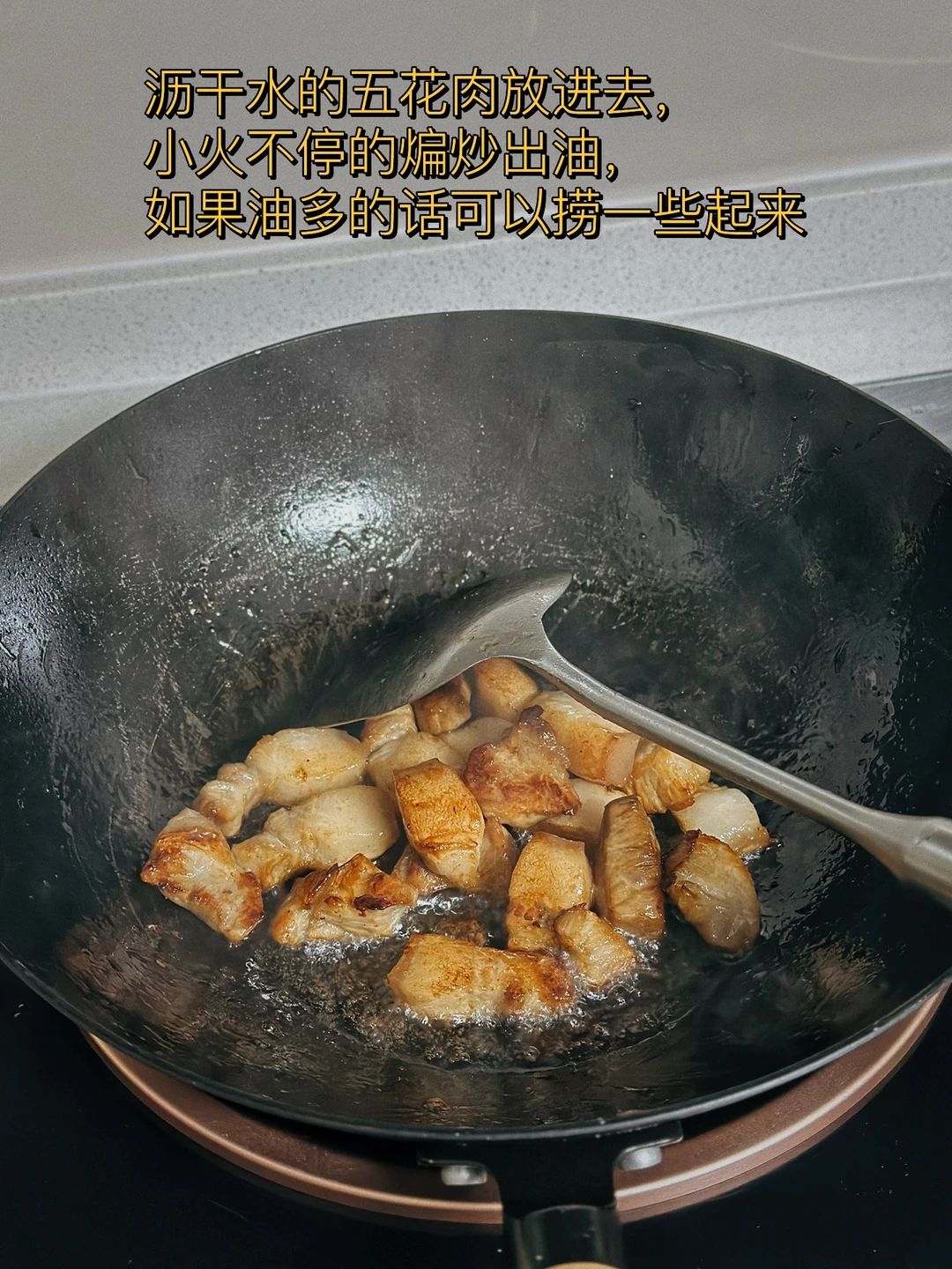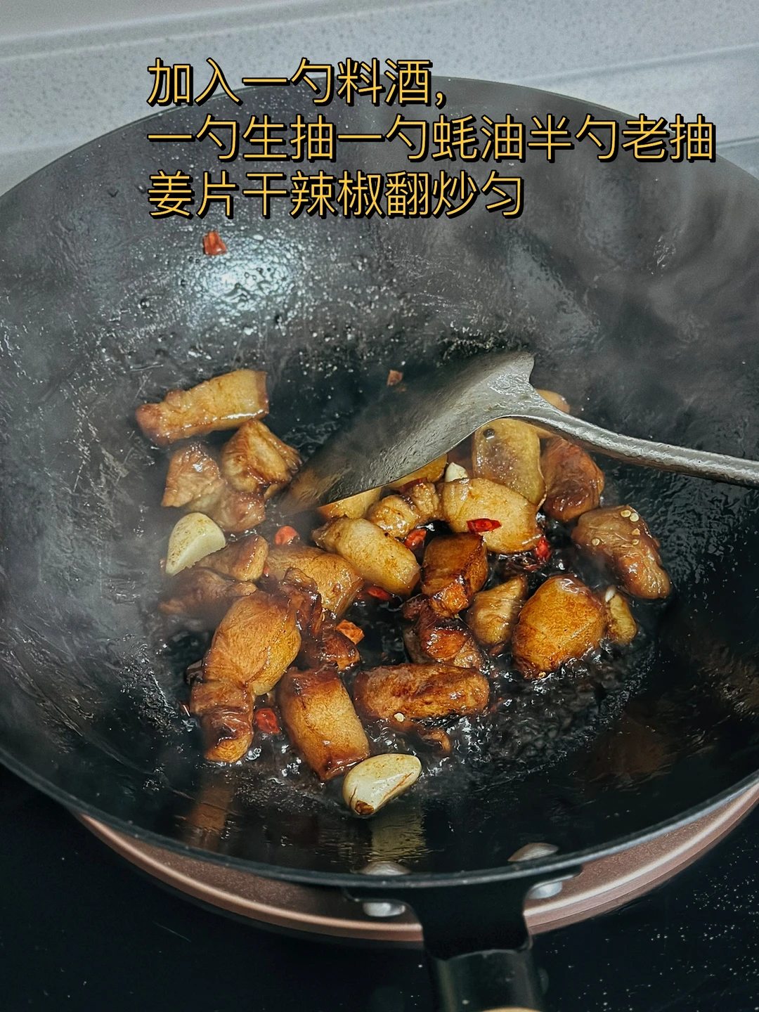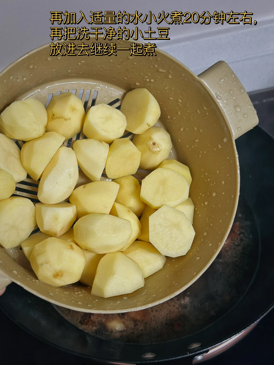 其实是想做排骨红烧小土豆的,奈何去看完电影回来的时候下雨就忘记买了,家里前几天做粽子剩下一些肉就拿出来凑合了一下小土豆呢,本来也是买来做煎小土豆的,结果一直都没有吃,突然间就很想吃这道菜那就折腾吧! 1. 选择肥瘦相间的五花肉最好我这个是前几天做粽子,剩下的就随便凑合了一下,冷水入锅加入姜片料酒煮开温水冲净浮沫 2. 热锅冷油放入冰糖,然后用锅铲不停的煸炒出糖色 3. 沥干水的五花肉放进去,小火不停的煸炒出油,如果油多的话可以捞一些起来 4. 加入一勺料酒,一勺生抽一勺蚝油半勺老抽姜片干辣椒翻炒匀 5. 再加入适量的水小火煮20分钟左右,再把洗干净的小土豆放进去继续一起煮 6. 汤汁剩三分之一左右的时候加入适量盐鸡粉调味同时转大火,不停的用锅铲翻炒收汁 7. 出锅前可以放一些蒜苗段或者葱花都可以,不喜欢吃辣的人可以不放辣椒,我们家一向比较重口味,所以放了点辣更提味儿
