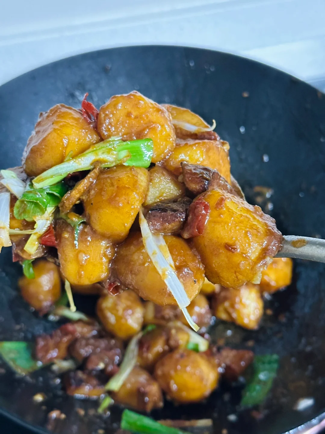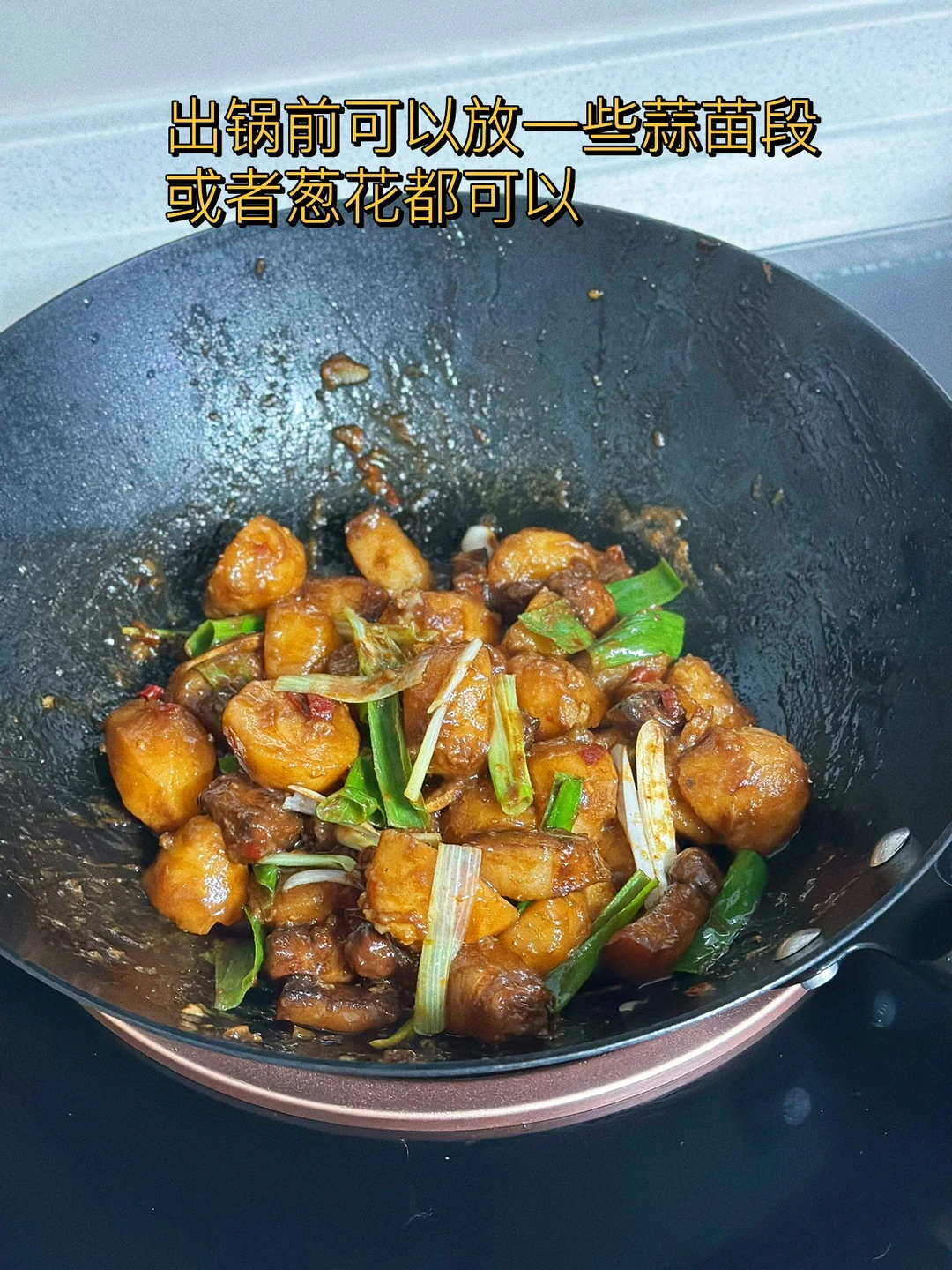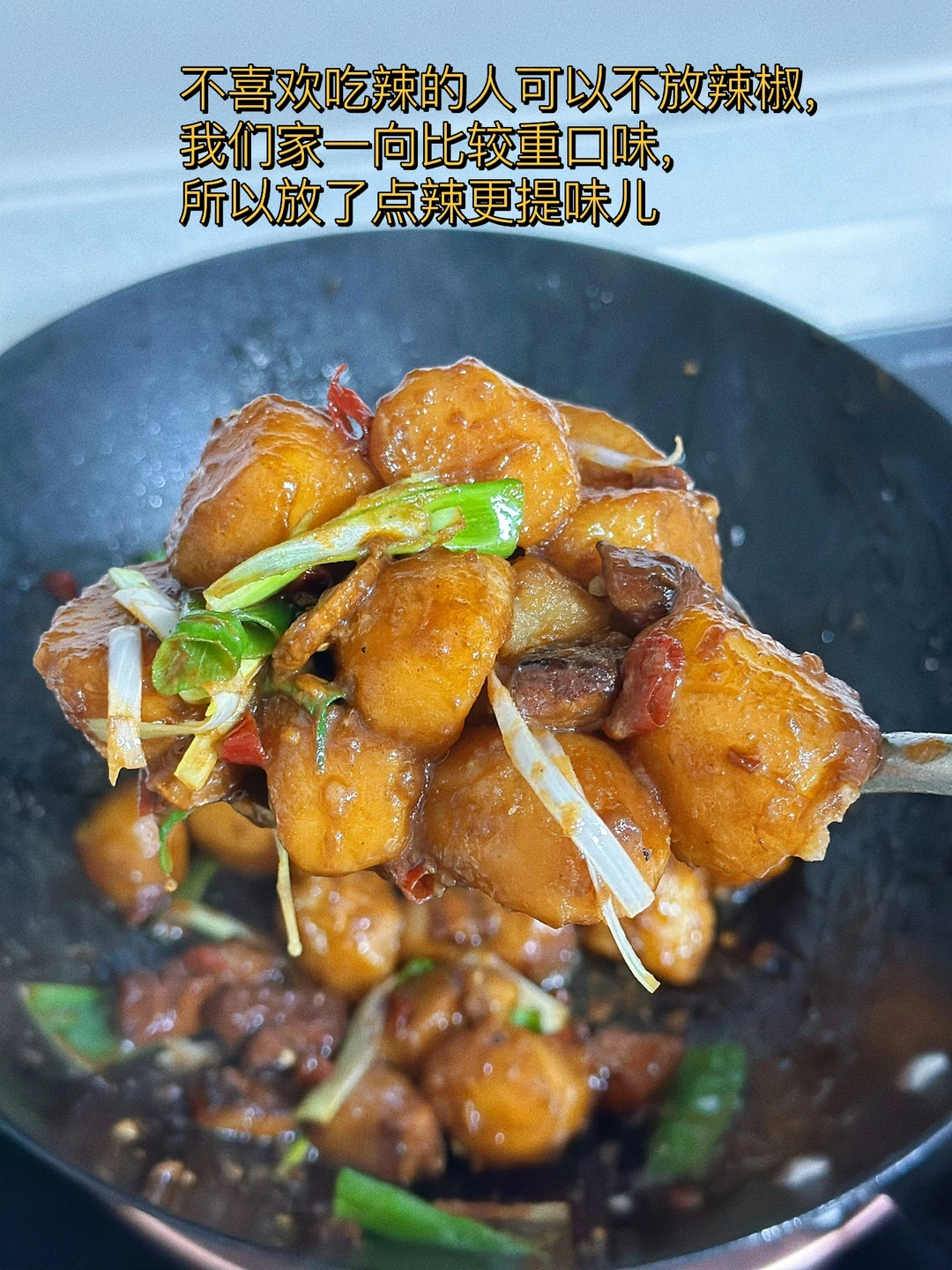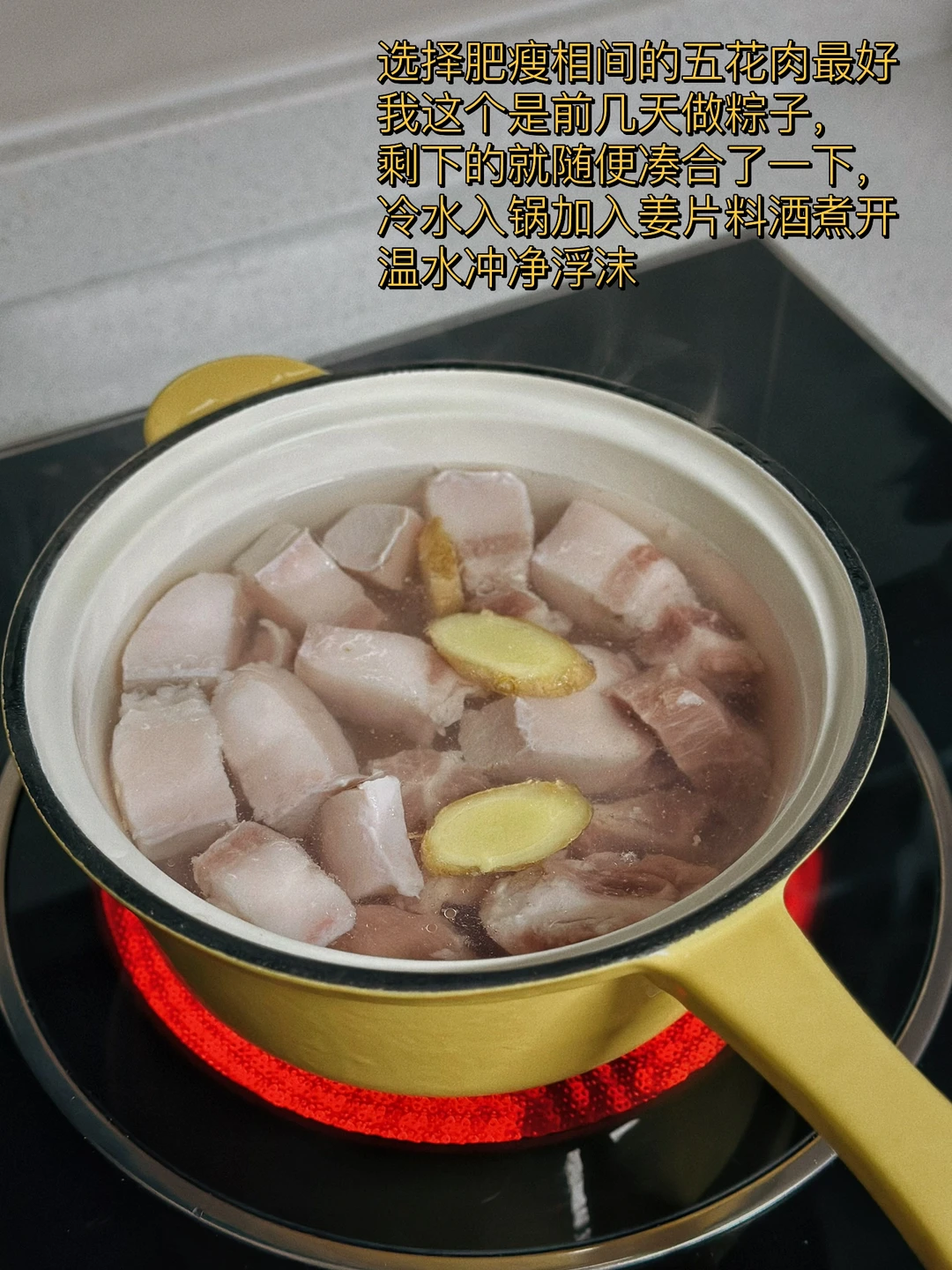 其实是想做排骨红烧小土豆的,奈何去看完电影回来的时候下雨就忘记买了,家里前几天做粽子剩下一些肉就拿出来凑合了一下小土豆呢,本来也是买来做煎小土豆的,结果一直都没有吃,突然间就很想吃这道菜那就折腾吧! 1. 选择肥瘦相间的五花肉最好我这个是前几天做粽子,剩下的就随便凑合了一下,冷水入锅加入姜片料酒煮开温水冲净浮沫 2. 热锅冷油放入冰糖,然后用锅铲不停的煸炒出糖色 3. 沥干水的五花肉放进去,小火不停的煸炒出油,如果油多的话可以捞一些起来 4. 加入一勺料酒,一勺生抽一勺蚝油半勺老抽姜片干辣椒翻炒匀 5. 再加入适量的水小火煮20分钟左右,再把洗干净的小土豆放进去继续一起煮 6. 汤汁剩三分之一左右的时候加入适量盐鸡粉调味同时转大火,不停的用锅铲翻炒收汁 7. 出锅前可以放一些蒜苗段或者葱花都可以,不喜欢吃辣的人可以不放辣椒,我们家一向比较重口味,所以放了点辣更提味儿