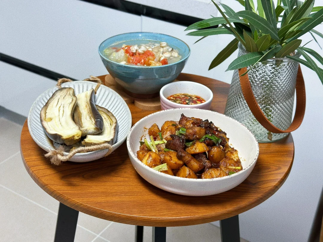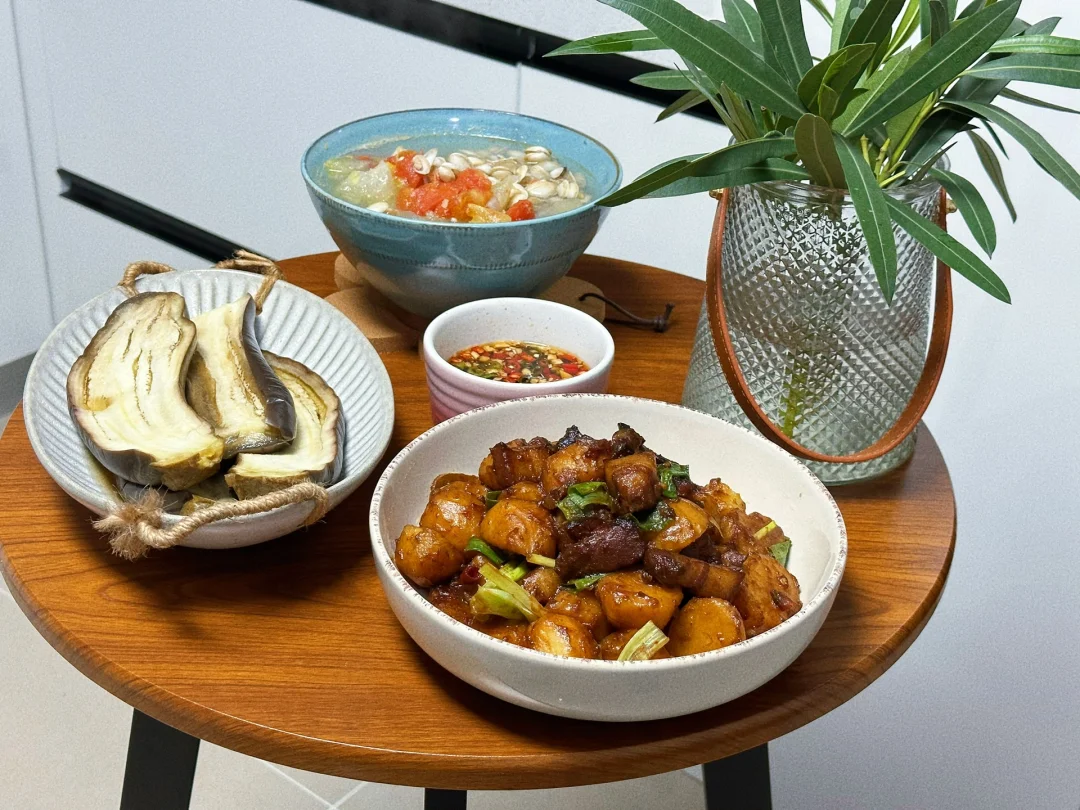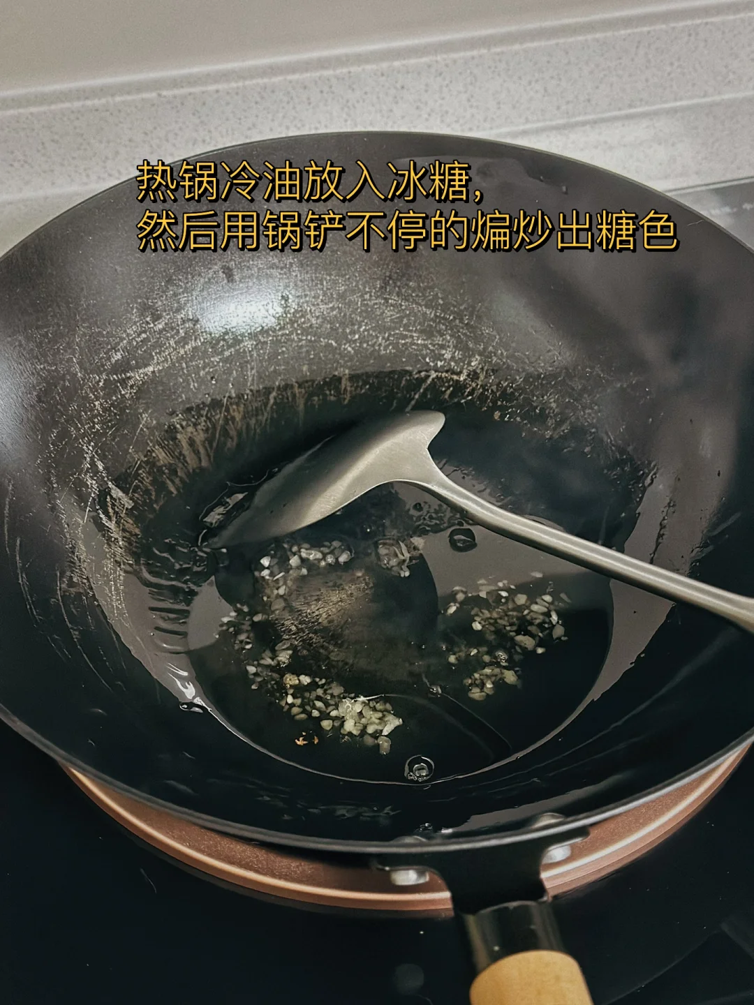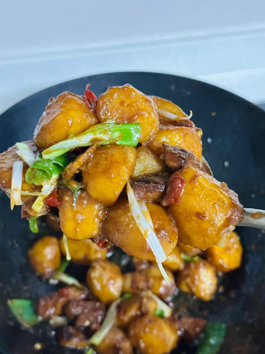 其实是想做排骨红烧小土豆的,奈何去看完电影回来的时候下雨就忘记买了,家里前几天做粽子剩下一些肉就拿出来凑合了一下小土豆呢,本来也是买来做煎小土豆的,结果一直都没有吃,突然间就很想吃这道菜那就折腾吧! 1. 选择肥瘦相间的五花肉最好我这个是前几天做粽子,剩下的就随便凑合了一下,冷水入锅加入姜片料酒煮开温水冲净浮沫 2. 热锅冷油放入冰糖,然后用锅铲不停的煸炒出糖色 3. 沥干水的五花肉放进去,小火不停的煸炒出油,如果油多的话可以捞一些起来 4. 加入一勺料酒,一勺生抽一勺蚝油半勺老抽姜片干辣椒翻炒匀 5. 再加入适量的水小火煮20分钟左右,再把洗干净的小土豆放进去继续一起煮 6. 汤汁剩三分之一左右的时候加入适量盐鸡粉调味同时转大火,不停的用锅铲翻炒收汁 7. 出锅前可以放一些蒜苗段或者葱花都可以,不喜欢吃辣的人可以不放辣椒,我们家一向比较重口味,所以放了点辣更提味儿