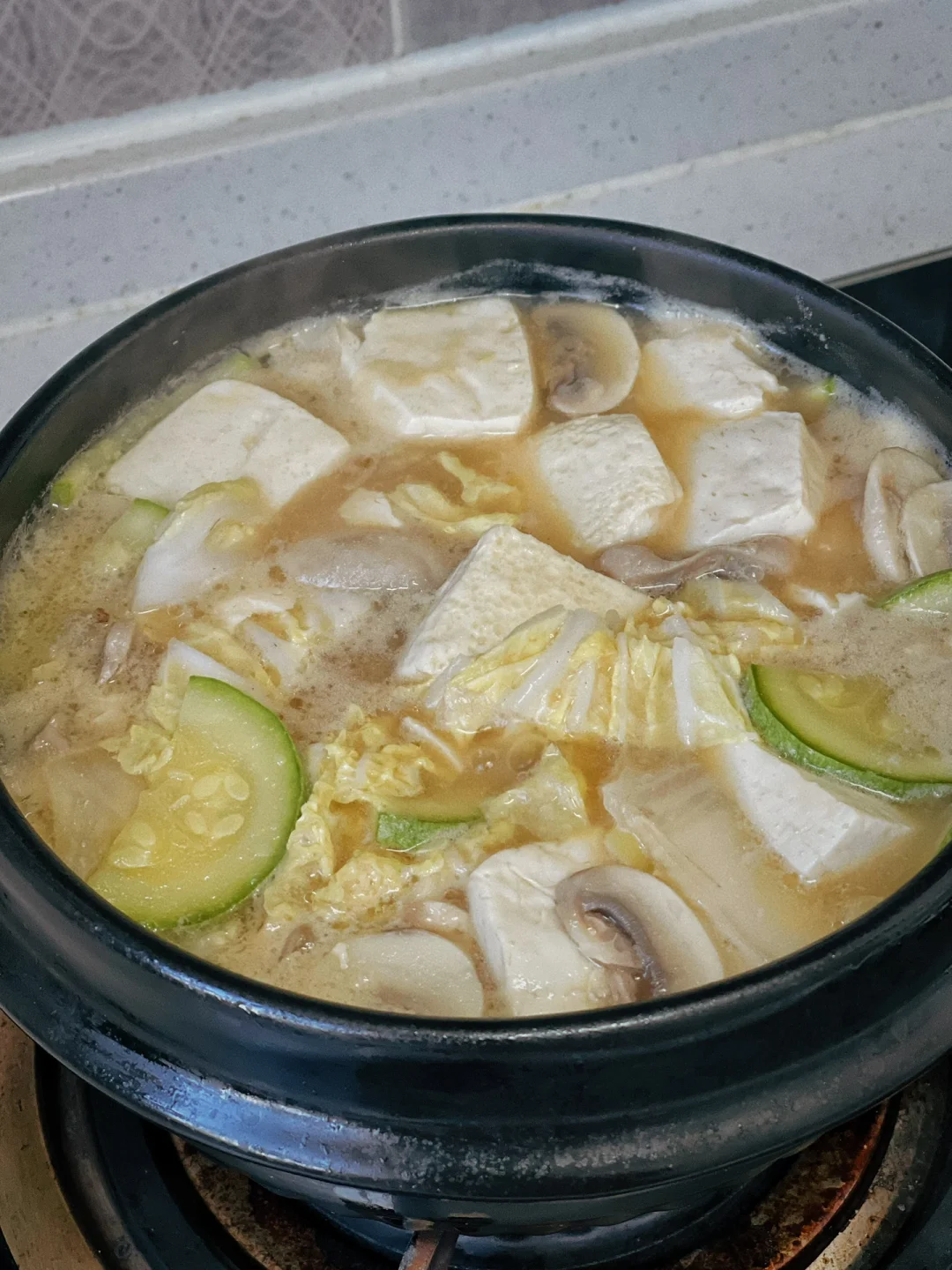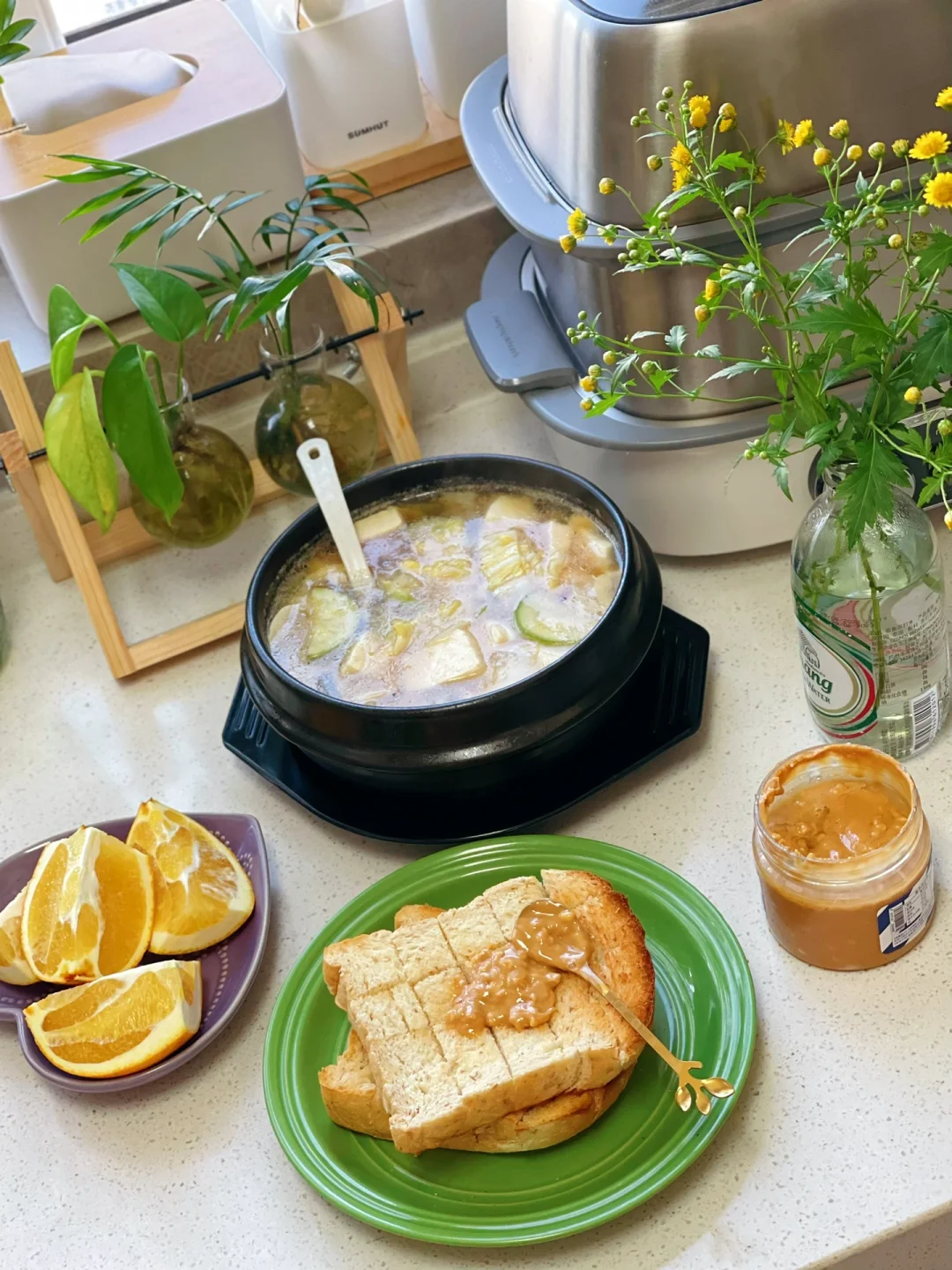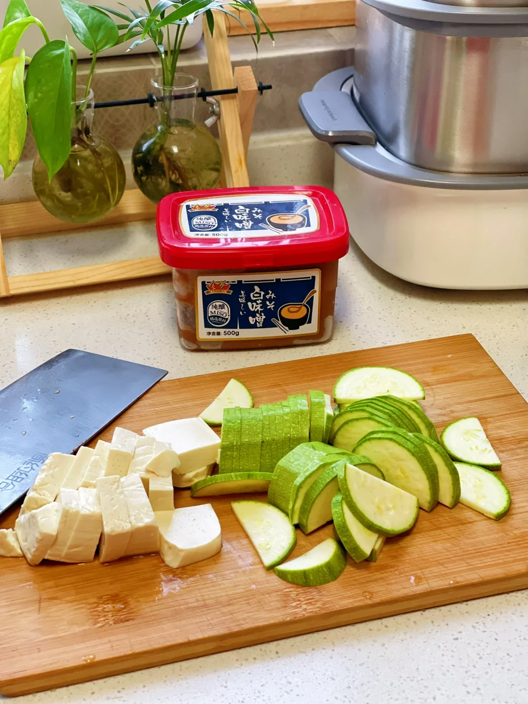 前天半夜一点钟下的单,本来以为第二天菜能到的,结果昨天没有到晚上朋友来家里吃饭,临时出去买了点菜,特意剩了点食材今天早上做了个味增汤! 锅里放少许油放了一些姜丝进去炒香加入适量的水,稍微煮一会把姜的味道煮出来再把自己喜欢的食材放进去,今天放了豆腐白蘑菇西葫芦煮至七成熟的时候加入白味增搅匀,加入适量盐鸡粉调味就可以 这几天苏州的天气还是蛮舒服的但是早上喝一点汤一天都精神了!剩余的半个吐司也烤了,配了点海盐颗粒花生酱居然也不错耶,朋友买的橙子皮虽然超级厚但是很甜[赞R]本来持怀疑态度的居然吃了一个