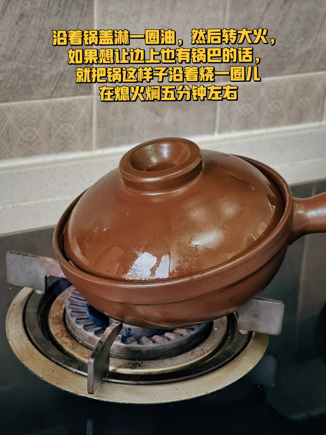 5. 沿着锅盖淋一圈油,然后转大火,如果想让边上也有锅巴的话,就把锅这样子沿着烧一圈儿在熄火焖五分钟左右