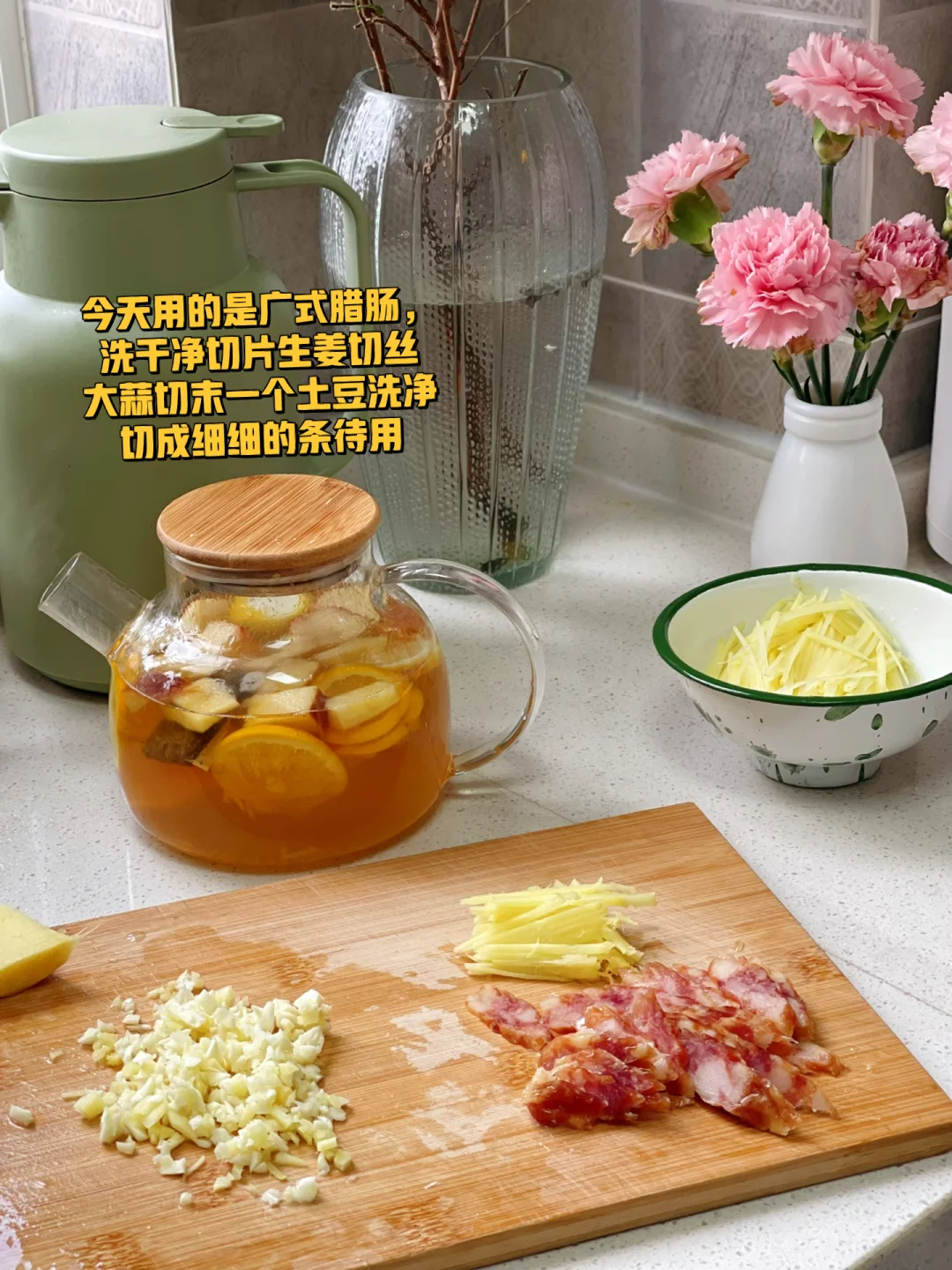 1. 今天用的是广式腊肠,洗干净切片生姜切丝大蒜切末一个土豆洗净切成细细的条待用