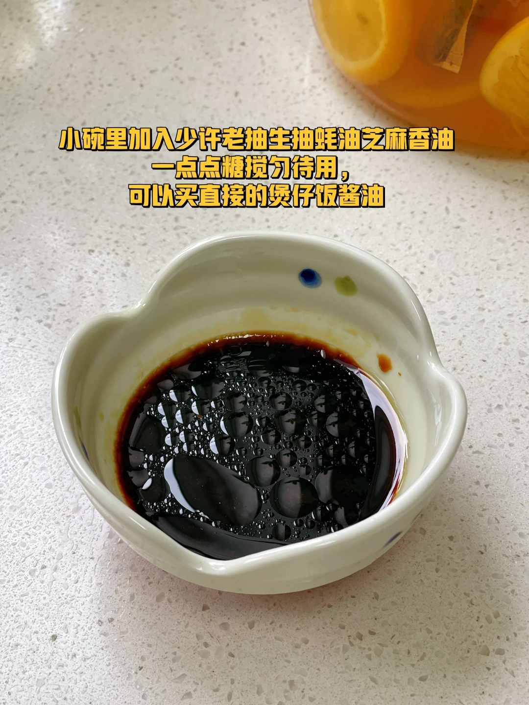7. 小碗里加入少许老抽生抽蚝油芝麻香油一点点糖搅匀待用,可以买直接的煲仔饭酱油