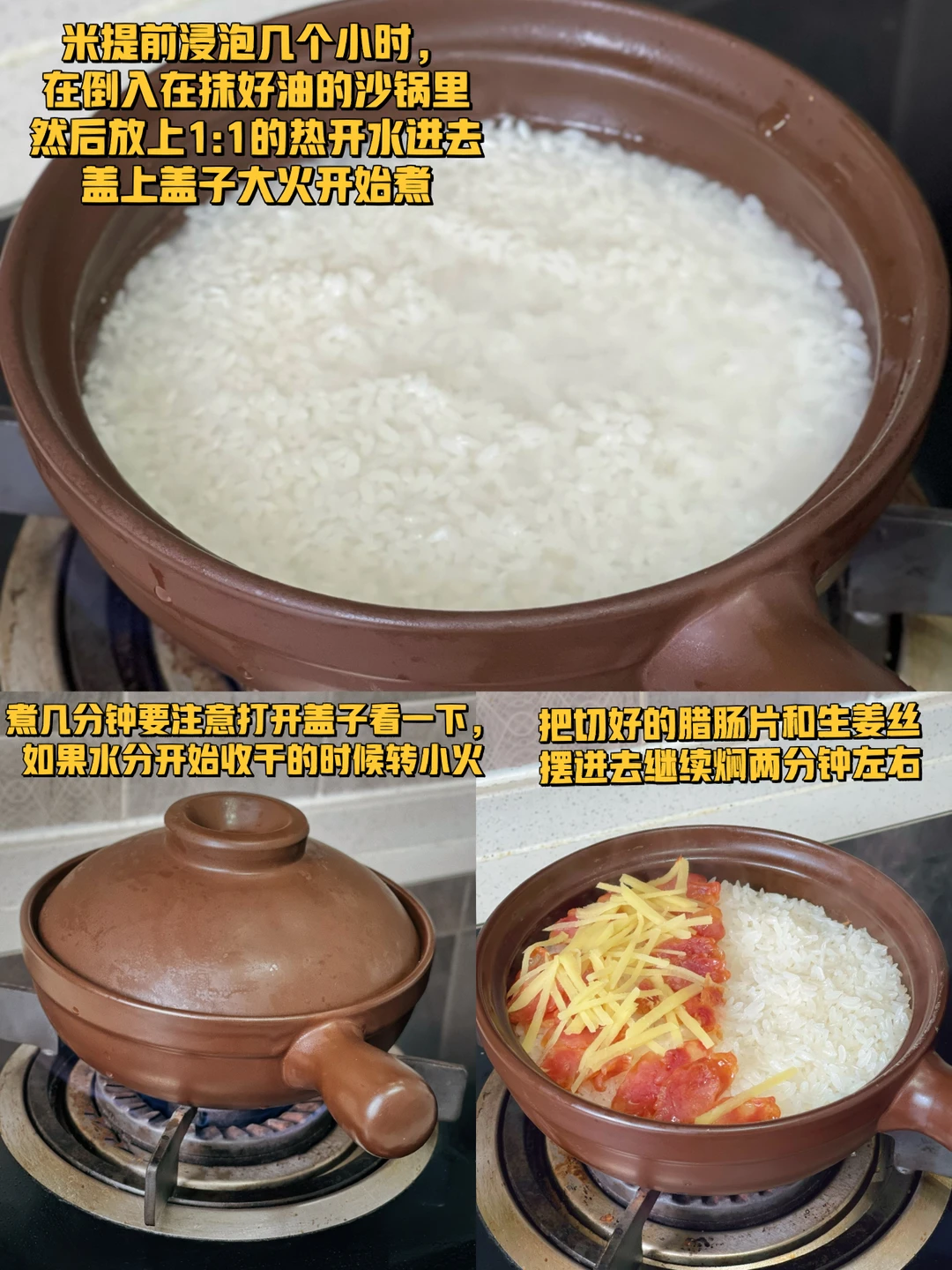2. 米提前浸泡几个小时,在倒入在抹好油的沙锅里然后放上1:1的热开水进去盖上盖子大火开始煮