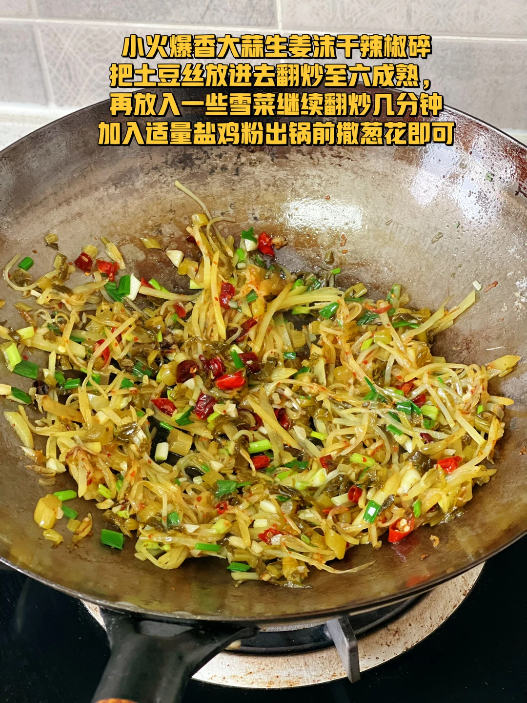 6. 小火爆香大蒜生姜沫干辣椒碎把土豆丝放进去翻炒至六成熟,再放入一些雪菜继续翻炒几分钟加入适量盐鸡粉出锅前撒葱花即可
